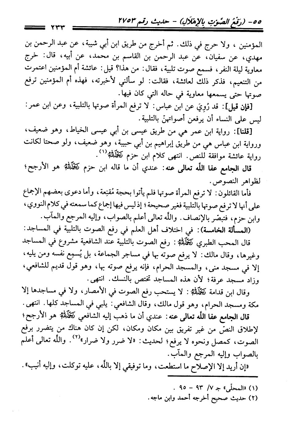 فأما القائلون: لا ترفع المرأة صوتها فلم يأتوا بحجة مُقنِعة، وأما دعوى بعضهم الإجماع على أنها لا ترفع صوتها بالتلبية فغير صحيحة؛ إذ ليس فيها إجماع كما سمعته في كلام النووي، وابن حزم، فتبصّر بالإنصاف. واللَّه تعالى أعلم بالصواب، وإليه المرجع والمآب.