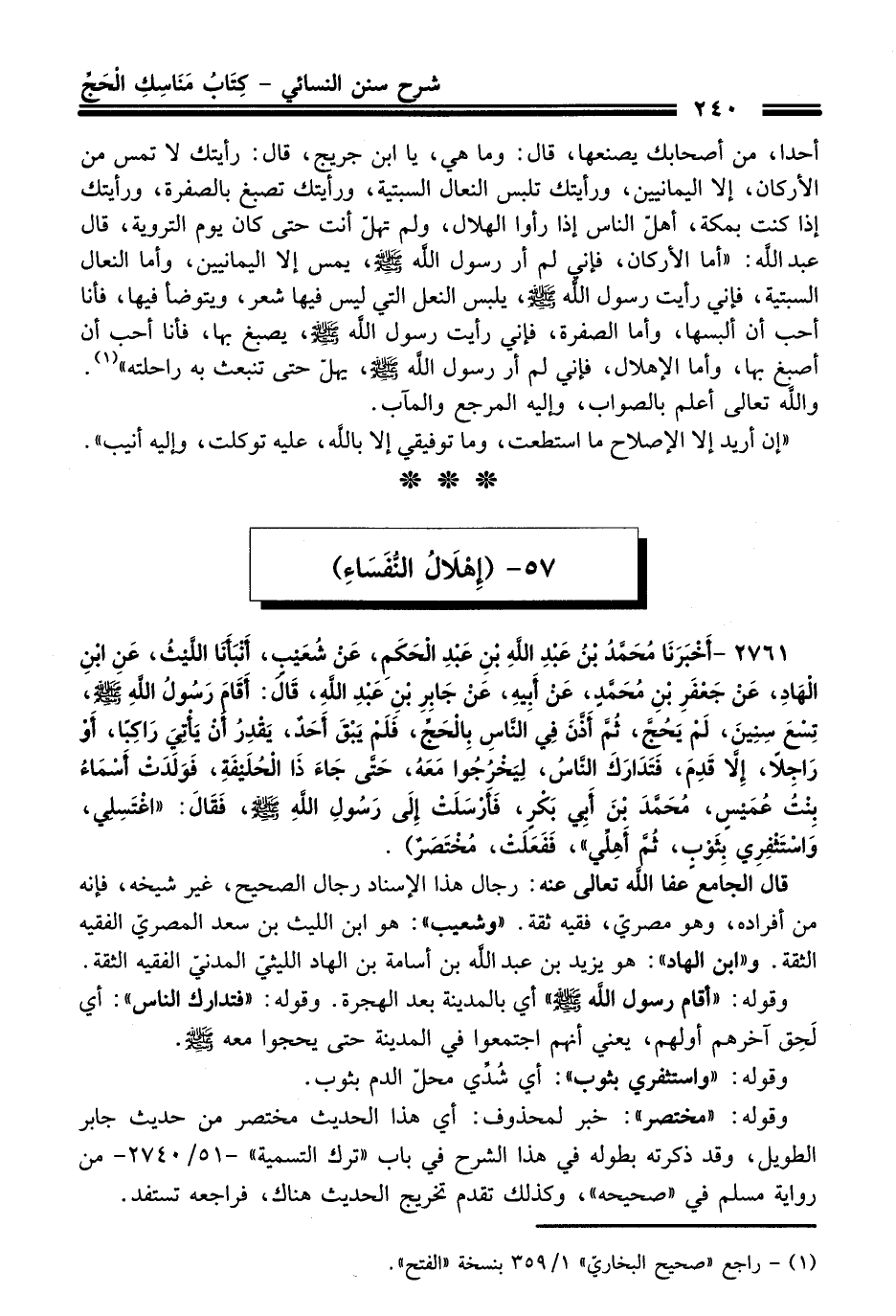 2761 - (أَخْبَرَنَا مُحَمَّدُ بْنُ عَبْدِ اللَّهِ بْنِ عَبْدِ الْحَكَمِ, عَنْ شُعَيْبٍ, أَنْبَأَنَا اللَّيْثُ, عَنِ ابْنِ الْهَادِ, عَنْ جَعْفَرِ بْنِ مُحَمَّدٍ, عَنْ أَبِيهِ, عَنْ جَابِرِ بْنِ عَبْدِ اللَّهِ, قَالَ: أَقَامَ رَسُولُ اللَّهِ - صلى اللَّه عليه وسلم -, تِسْعَ سِنِينَ, لَمْ يَحُجَّ, ثُمَّ أَذَّنَ فِي النَّاسِ بِالْحَجِّ, فَلَمْ يَبْقَ أَحَدٌ, يَقْدِرُ أَنْ يَأْتِيَ رَاكِبًا, أَوْ رَاجِلاً, إِلاَّ قَدِمَ فَتَدَارَكَ النَّاسُ, لِيَخْرُجُوا مَعَهُ, حَتَّى جَاءَ ذَا الْحُلَيْفَةِ, فَوَلَدَتْ أَسْمَاءُ بِنْتُ عُمَيْسٍ, مُحَمَّدَ بْنَ أَبِي بَكْرٍ, فَأَرْسَلَتْ إِلَى رَسُولِ اللَّهِ - صلى اللَّه عليه وسلم -, فَقَالَ: «اغْتَسِلِي, وَاسْتَثْفِرِي بِثَوْبٍ, ثُمَّ أَهِلِّي» , فَفَعَلَتْ, مُخْتَصَرٌ).