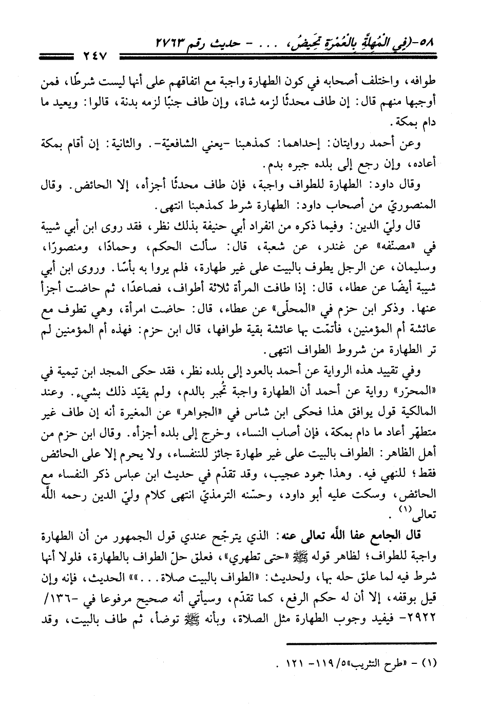 قال الجامع - عفا اللَّه تعالى عنه -: الذي يترجّح عندي قول الجمهور من أن الطهارة واجبة للطواف؛ لظاهر قوله - صلى اللَّه عليه وسلم - "حتى تطهري"، فعلق حلّ الطواف بالطهارة، فلولا أنها شرط فيه لما علق حله بها, ولحديث: "الطواف بالبيت صلاة ... " الحديث، فإنه وإن قيل بوقفه، إلا أن له حكم الرفع، كما تقدّم، وسيأتي أنه صحيح مرفوعًا في -136/ 2922 - فيفيد وجوب الطهارة مثل الصلاة، وبأنه - صلى اللَّه عليه وسلم - توضأ، ثم طاف بالبيت، وقد