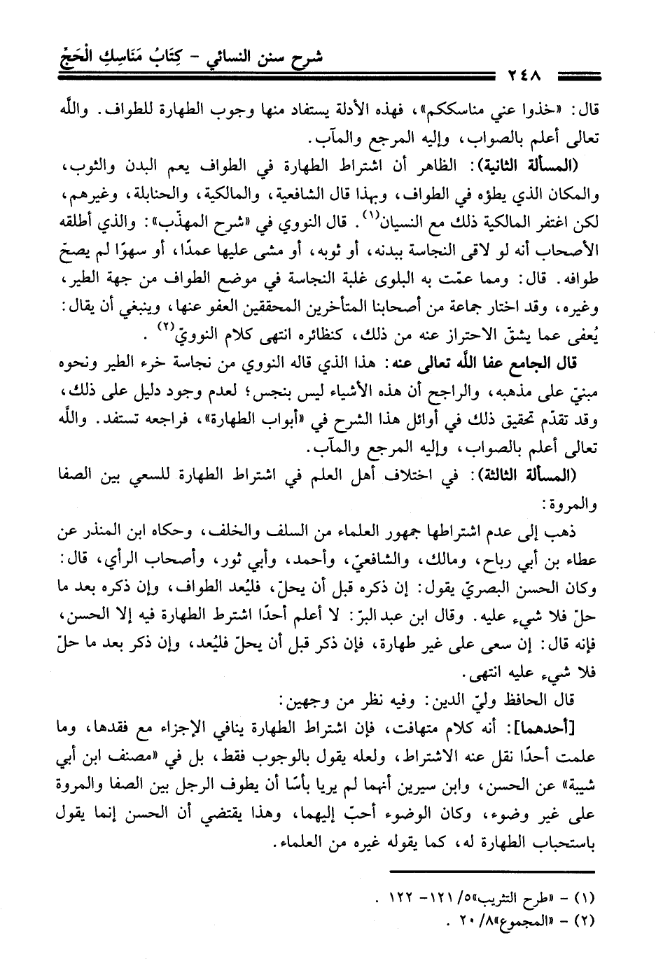 [أحدهما]: أنه كلام متهافت، فإن اشتراط الطهارة ينافي الإجزاء مع فقدها، وما علمت أحدًا نقل عنه الاشتراط، ولعله يقول بالوجوب فقط، بل في "مصنف ابن أبي شيبة" عن الحسن، وابن سيرين أنهما لم يريا بأسًا أن يطوف الرجل بين الصفا والمروة على غير وضوء، وكان الوضوء أحبّ إليهما، وهذا يقتضي أن الحسن إنما يقول باستحباب الطهارة له، كما يقوله غيره من العلماء.