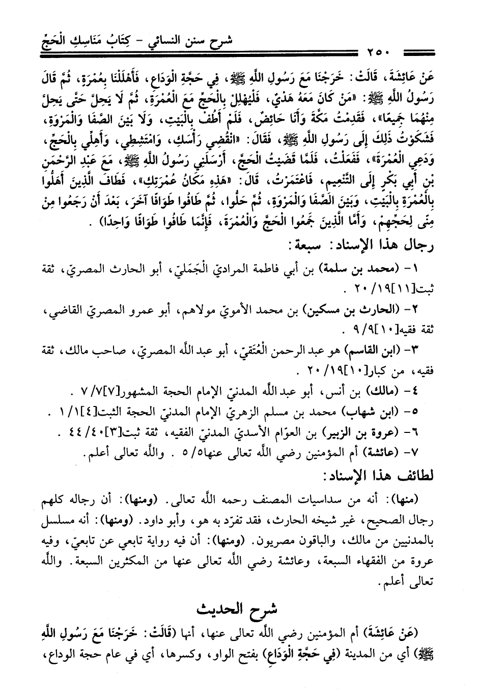 عَنْ عَائِشَةَ, قَالَتْ: خَرَجْنَا مَعَ رَسُولِ اللَّهِ - صلى اللَّه عليه وسلم -, فِي حَجَّةِ الْوَدَاعِ, فَأَهْلَلْنَا بِعُمْرَةٍ, ثُمَّ قَالَ رَسُولُ اللَّهِ - صلى اللَّه عليه وسلم -: «مَنْ كَانَ مَعَهُ هَدْيٌ, فَلْيُهْلِلْ بِالْحَجِّ مَعَ الْعُمْرَةِ, ثُمَّ لاَ يَحِلُّ حَتَّى يَحِلَّ مِنْهُمَا جَمِيعًا» , فَقَدِمْتُ مَكَّةَ وَأَنَا حَائِضٌ, فَلَمْ أَطُفْ بِالْبَيْتِ, وَلاَ بَيْنَ الصَّفَا وَالْمَرْوَةِ, فَشَكَوْتُ ذَلِكَ إِلَى رَسُولِ اللَّهِ - صلى اللَّه عليه وسلم -, فَقَالَ: «انْقُضِي رَأْسَكِ, وَامْتَشِطِي, وَأَهِلِّي بِالْحَجِّ, وَدَعِي الْعُمْرَةَ» , فَفَعَلْتُ, فَلَمَّا قَضَيْتُ الْحَجَّ, أَرْسَلَنِي رَسُولُ اللَّهِ - صلى اللَّه عليه وسلم -, مَعَ عَبْدِ الرَّحْمَنِ بْنِ أَبِي بَكْرٍ إِلَى التَّنْعِيمِ, فَاعْتَمَرْتُ, قَالَ: «هَذِهِ مَكَانُ عُمْرَتِكِ» , فَطَافَ الَّذِينَ أَهَلُّوا بِالْعُمْرَةِ بِالْبَيْتِ, وَبَيْنَ الصَّفَا وَالْمَرْوَةِ, ثُمَّ حَلُّوا, ثُمَّ طَافُوا طَوَافًا آخَرَ, بَعْدَ أَنْ رَجَعُوا مِنْ مِنًى لِحَجِّهِمْ, وَأَمَّا الَّذِينَ جَمَعُوا الْحَجَّ وَالْعُمْرَةَ, فَإِنَّمَا طَافُوا طَوَافًا وَاحِدًا).