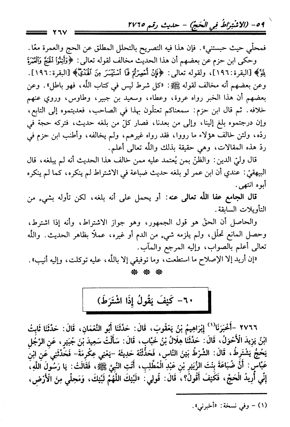 قال وليّ الدين. والظنّ بمن يُعتمد عليه ممن خالف هذا الحديث أنه لم يبلغه، قال البيهقيّ: عندي أن ابن عمر لو بلغه حديث ضباعة في الاشتراط لم ينكره، كما لم ينكره أبوه انتهى.