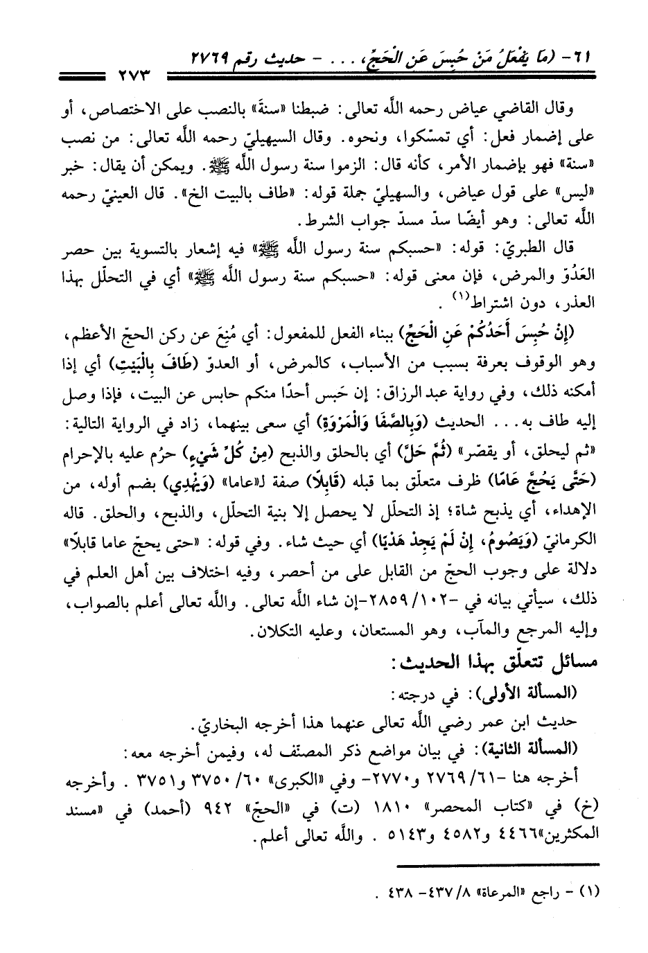 قال الطبريّ: قوله: "حسبكم سنة رسول اللَّه - صلى اللَّه عليه وسلم -" فيه إشعار بالتسوية بين حصر العَدُوّ والمرض، فإن معنى قوله: "حسبكم سنة رسول اللَّه - صلى اللَّه عليه وسلم -" أي في التحلّل بهذا العذر، دون اشتراط (¬1).