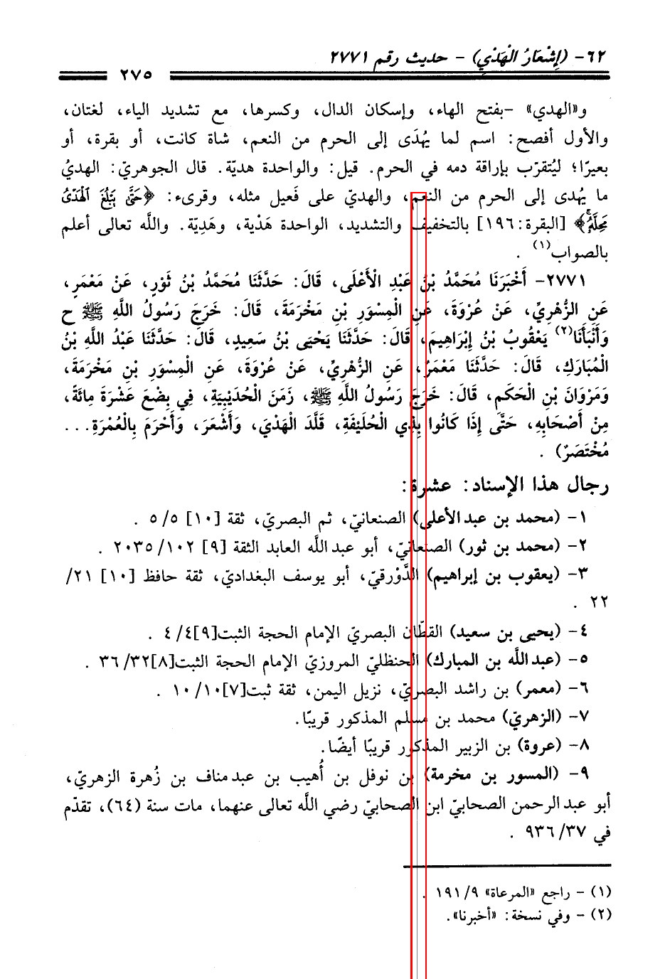 2771 - (أَخْبَرَنَا مُحَمَّدُ بْنُ عَبْدِ الأَعْلَى, قَالَ: حَدَّثَنَا مُحَمَّدُ بْنُ ثَوْرٍ, عَنْ مَعْمَرٍ, عَنِ الزُّهْرِيِّ, عَنْ عُرْوَةَ, عَنِ الْمِسْوَرِ بْنِ مَخْرَمَةَ, قَالَ: خَرَجَ رَسُولُ اللَّهِ - صلى اللَّه عليه وسلم - ح وَأَنْبَأَنَا (¬2) يَعْقُوبُ بْنُ إِبْرَاهِيمَ, قَالَ: حَدَّثَنَا يَحْيَى بْنُ سَعِيدٍ, قَالَ: حَدَّثَنَا عَبْدُ اللَّهِ بْنُ الْمُبَارَكِ, قَالَ: حَدَّثَنَا مَعْمَرٌ, عَنِ الزُّهْرِيِّ, عَنْ عُرْوَةَ, عَنِ الْمِسْوَرِ بْنِ مَخْرَمَةَ, وَمَرْوَانَ بْنِ الْحَكَمِ, قَالَ: خَرَجَ رَسُولُ اللَّهِ - صلى اللَّه عليه وسلم -, زَمَنَ الْحُدَيْبِيَةِ, فِي بِضْعَ عَشْرَةَ مِائَةٍ, مِنْ أَصْحَابِهِ, حَتَّى إِذَا كَانُوا بِذِي الْحُلَيْفَةِ, قَلَّدَ الْهَدْيَ, وَأَشْعَرَ, وَأَحْرَمَ بِالْعُمْرَةِ ... مُخْتَصَرٌ).
