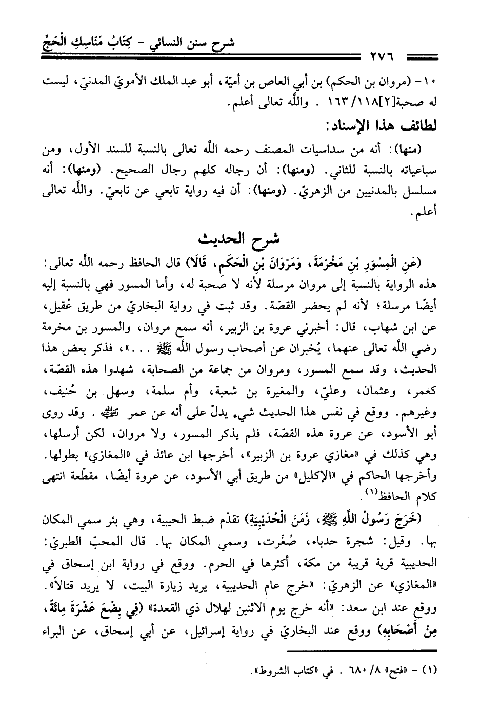 (عَنِ الْمِسْوَرِ بْنِ مَخْرَمَةَ، وَمَرْوَانَ بْنِ الْحَكَمِ، قَالاَ) قال الحافظ -رحمه اللَّه تعالى-: هذه الرواية بالنسبة إلى مروان مرسلة لأنه لا صحبة له، وأما المسور فهي بالنسبة إليه أيضًا مرسلة؛ لأنه لم يحضر القصّة. وقد ثبت في رواية البخاريّ من طريق عُقيل، عن ابن شهاب، قال: أخبرني عروة بن الزبير، أنه سمع مروان، والمسور بن مخرمة - رضي اللَّه تعالى عنهما -، يُخبران عن أصحاب رسول اللَّه - صلى اللَّه عليه وسلم - ... "، فذكر بعض هذا الحديث، وقد سمع المسور، ومروان من جماعة من الصحابة، شهدوا هذه القصّة، كعمر، وعثمان، وعليّ، والمغيرة بن شعبة، وأم سلمة، وسهل بن حُنيف، وغيرهم. ووقع في نفس هذا الحديث شيء يدلّ على أنه عن عمر - رضي اللَّه عنه -. وقد روى أبو الأسود، عن عروة هذه القصّة، فلم يذكر المسور، ولا مروان، لكن أرسلها، وهي كذلك في "مغازي عروة بن الزبير"، أخرجها ابن عائذ في "المغازي" بطولها. وأخرجها الحاكم في "الإكليل" من طريق أبي الأسود، عن عروة أيضًا، مقطّعة انتهى كلام الحافظ (¬1).
