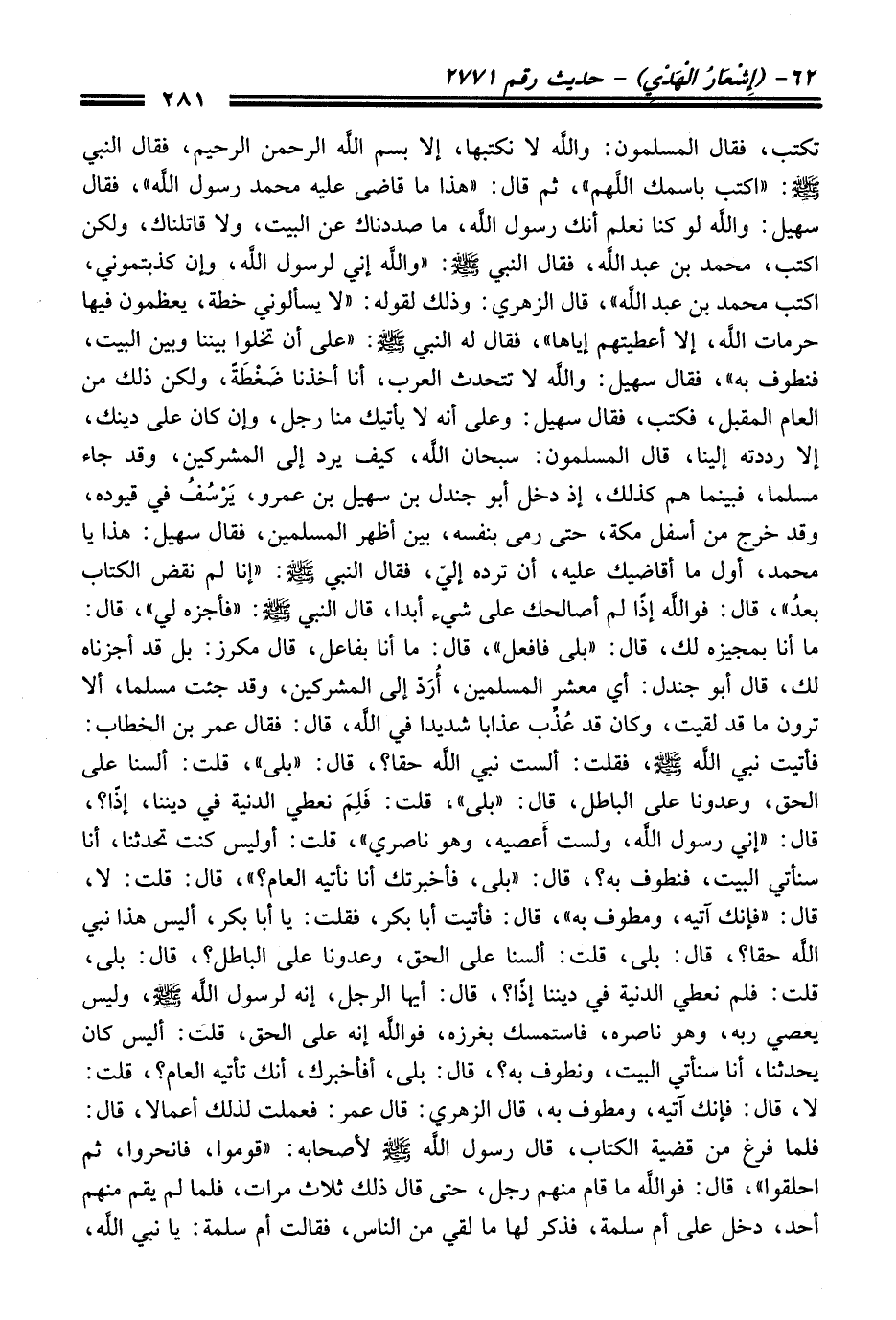 تكتب، فقال المسلمون: واللَّه لا نكتبها، إلا بسم اللَّه الرحمن الرحيم، فقال النبي - صلى اللَّه عليه وسلم -: "اكتب باسمك اللَّهم"، ثم قال: "هذا ما قاضى عليه محمد رسول اللَّه"، فقال سهيل: واللَّه لو كنا نعلمِ أنك رسول اللَّه، ما صددناك عن البيت، ولا قاتلناك، ولكن اكتب، محمد بن عبد اللَّه، فقال النبي - صلى اللَّه عليه وسلم -: "واللَّه إني لرسول اللَّه، وإن كذبتموني، اكتب محمد بن عبد اللَّه"، قال الزهري: وذلك لقوله: "لا يسألوني خطة، يعظمون فيها حرمات اللَّه، إلا أعطيتهم إياها"، فقال له النبي - صلى اللَّه عليه وسلم -: "على أن تخلوا بيننا وبين البيت، فنطوف به"، فقال سهيل: واللَّه لا تتحدث العرب، أنا أخذنا ضَغْطَةً، ولكن ذلك من العام المقبل، فكتب، فقال سهيل: وعلى أنه لا يأتيك منا رجل، وإن كان على دينك، إلا رددته إلينا، قال المسلمون: سبحان اللَّه، كيف يرد إلى المشركين، وقد جاء مسلما، فبينما هم كذلك، إذ دخل أبو جندل بن سهيل بن عمرو، يَرْسُف في قيوده، وقد خرج من أسفل مكة، حتى رمى بنفسه، بين أظهر المسلمين، فقال سهيل: هذا يا محمد، أول ما أقاضيك عليه، أن ترده إليّ، فقال النبي - صلى اللَّه عليه وسلم -: "إنا لم نقض الكتاب بعدُ"، قال: فواللَّه إذًا لم أصالحك على شيء أبدا، قال النبي - صلى اللَّه عليه وسلم -: "فأجزه لي"، قال: ما أنا بمجيزه لك، قال: "بلى فافعل"، قال: ما أنا بفاعل، قال مكرز: بل قد أجزناه لك، قال أبو جندل: أي معشرٍ المسلمين، أُرَدّ إلى المشركين، وقد جئت مسلما، ألا ترون ما قد لقيت، وكان قد عُذِّب عذابا شديدا في اللَّه، قال: فقال عمر بن الخطاب: فأتيت نبي اللَّه - صلى اللَّه عليه وسلم -، فقلت: ألست نبي اللَّه حقا؟، قال: "بلى"، قلت: ألسنا على الحقّ، وعدونا على الباطل، قال: "بلى"، قلت: فَلِمَ نعطي الدنية في ديننا، إذاً؟، قال: "إني رسول اللَّه، ولست أَعصيه، وهو ناصري"، قلت: أوليس كنت تحدثنا، أنا سنأتي البيت، فنطوف به؟، قال: "بلى، فأخبرتك أنا نأتيه العام؟ "، قال: قلت: لا، قال: "فإنك آتيه، ومطوف به"، قال: فأتيت أبا بكر، فقلت: يا أبا بكر، أليس هذا نبي اللَّه حقا؟، قال: بدى، قلت: ألسنا على الحق، وعدونا على الباطل؟، قال: بلى، قلت: فلم نعطي الدنية في ديننا إذًا؟، قال: أيها الرجل، إنه لرسول اللَّه - صلى اللَّه عليه وسلم -، وليس يعصي ربه، وهو ناصره، فاستمسك بغرزه، فواللَّه إنه على الحق، قلت: أليس كان يحدثنا، أنا سنأتي البيت، ونطوف به؟، قال: بلى، أفأخبرك، أنك تأتيه العام؟، قلت: لا، قال: فإنك آتيه، ومطوف به، قال الزهري: قال عمر: فعملت لذلك أعمالا، قال: فلما فرغ من قضية الكتاب، قال رسول اللَّه - صلى اللَّه عليه وسلم - لأصحابه: "قوموا، فانحروا، ثم احلقوا"، قال: فواللَّه ما قام منهم رجل، حتى قال ذلك ثلاث مرات، فلما لم يقم منهم أحد، دخل على أم سلمة، فذكر لها ما لقي من الناس، فقالت أم سلمة: يا نبي اللَّه،