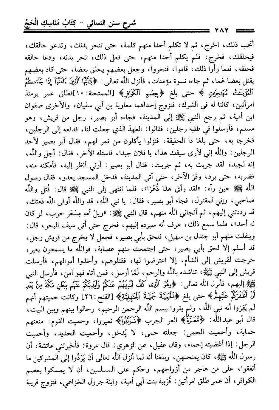 أتحب ذلك، اخرج، ثم لا تكلم أحدا منهم كلمة، حتى تنحر بدنك، وتدعو حالقك، فيحلقك، فخرج، فلم يكلم أحدا منهم، حتى فعل ذلك، نحو بدنه، ودعا حالقه فحلقه، فلما رأوا ذلك، قاموا، فنحروا، وجعل بعضهم يحلق بعضا، حتى كاد بعضهم يقتل بعضا غما، ثم جاءه نسوة مؤمنات، فأنزل اللَّه تعالى: {يَا أَيُّهَا الَّذِينَ آمَنُوا إِذَا جَاءَكُمُ الْمُؤْمِنَاتُ مُهَاجِرَاتٍ} حتى بلغ {بِعِصَمِ الْكَوَافِرِ} [الممتحنة: 10] فطلق عمر يومئذ امرأتين، كانتا له في الشرك، فتزوج إحداهما معاوية بن أبي سفيان، والأخرى صفوان ابن أمية، ثم رجع النبي - صلى اللَّه عليه وسلم - إلى المدينة، فجاءه أبو بصير، رجل من قريش، وهو مسلم، فأرسلوا في طلبه رجلين، فقالوا: العهدَ الذي جعلت لنا، فدفعه إلى الرجلين، فخرجا به، حتى بلغا ذا الحليفة، فنزلوا يأكلون من تمر لهم، فقال أبو بصير لأحد الرجلين: واللَّه إني لأرى سيفك هذا، يا فلان جيدا، فاستله الآخر، فقال: أجل واللَّه، إنه لجيد، لقد جربت به، ثم جربت، فقال أبو بصير: أرني انظر إليه، فأمكنه منه، فضربه، حتى برد، وفَرّ الآخر، حتى أتى المدينة، فدخل المسجد يعدو، فقال رسول اللَّه - صلى اللَّه عليه وسلم - حين رآه: "لقد رأى هذا ذُعْرًا"، فلما انتهى إلى النبي - صلى اللَّه عليه وسلم - قال: قُتل واللَّه صاحبي، وإني لمقتول، فجاء أبو بصير، فقال: يا نبي اللَّه، قد واللَّه أوفى اللَّه ذمتك، قد رددتني إليهم، ثم أنجاني اللَّه منهم، قال النبي - صلى اللَّه عليه وسلم -: "ويلُ أمه مِسْعَر حرب، لو كان له أحد"، فلما سمع ذلك، عرف أنه سيرده إليهم، فخرج حتى أتى سيف البحر، قال: وينفلت منهم أبو جندل بن سهيل، فلحق بأبي بصير، فجعل لا يخرج من قريش رجل، قد أسلم إلا لحق بأبي بصير، حتى اجتمعت منهم عصابة، فواللَّه ما يسمعون بعير، خرجت لقريش إلى الشأم، إلا اعترضوا لها، فقتلوهم، وأخذوا أموالهم، فأرسلت قريش إلى النبي - صلى اللَّه عليه وسلم -، تناشده باللَّه والرحم، لَمّا أرسل، فمن أتاه فهو آمن، فأرسل النبي - صلى اللَّه عليه وسلم - إليهم، فأنزل اللَّه تعالى: {وَهُوَ الَّذِي كَفَّ أَيْدِيَهُمْ عَنْكُمْ وَأَيْدِيَكُمْ عَنْهُمْ بِبَطْنِ مَكَّةَ مِنْ بَعْدِ أَنْ أَظْفَرَكُمْ عَلَيْهِمْ} حتى بلغ {الْحَمِيَّةَ حَمِيَّةَ الْجَاهِلِيَّةِ} [الفتح: 26] وكانت حميتهم أنهم لم يُقِرّوا أنه نبي اللَّه، ولم يقروا ببسم اللَّه الرحمن الرحيم، وحالوا بينهم وبين البيت، قال أبو عبد اللَّه: {مَعَرَّةٌ} العر الجرب {تَزَيَّلُوا} تميزوا، وحميت القوم: منعتهم حماية، وأحميت الحمى: جعلته حمى، لا يُدخل، وأحميت الحديد، وأحميت الرجل: إذا أغضبته إحماء، وقال عقيل، عن الزهري: قال عروة: فأخبرتني عائشة، أن رسول اللَّه - صلى اللَّه عليه وسلم -، كان يمتحنهن، وبلغنا أنه لما أنزل اللَّه تعالى أن يَرُدُّوا إلى المشركين ما أنفقوا، على من هاجر من أزواجهم، وحكم على المسلمين، أن لا يمسكوا بعصم الكوافر، أن عمر طلق امرأتين: قُرَيبة بنت أبي أمية، وابنة جرول الخزاعي، فتزوج قريبة