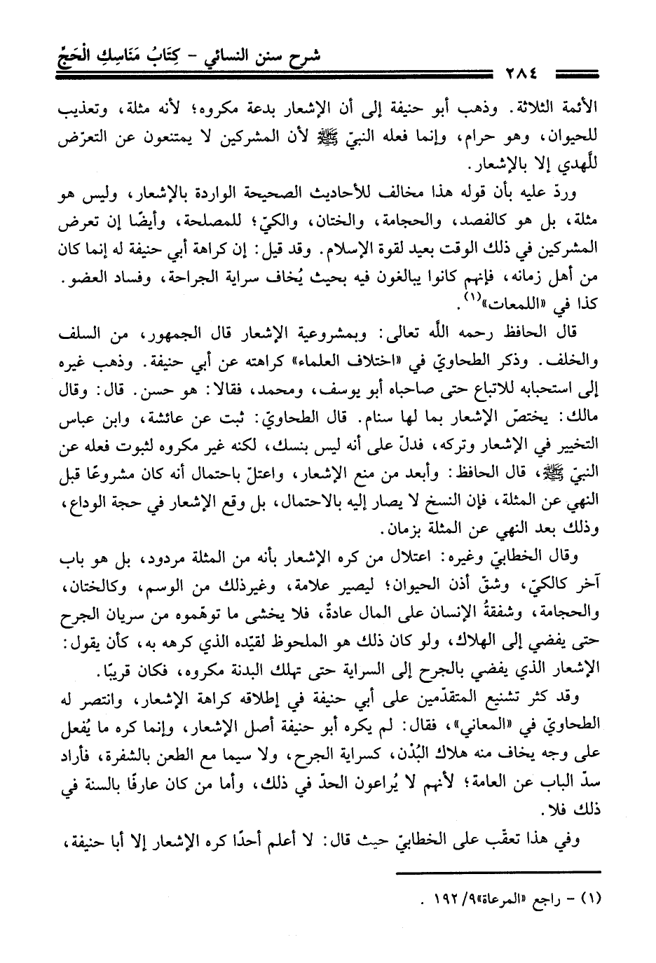 وقد كثر تشنيع المتقدّمين على أبي حنيفة في إطلاقه كراهة الإشعار، وانتصر له الطحاويّ في "المعاني"، فقال: لم يكره أبو حنيفة أصل الإشعار، وإنما كره ما يُفعل على وجه يخاف منه هلاك البُدْن، كسراية الجرح، ولا سيما مع الطعن بالشفرة، فأراد سدّ الباب عن العامة؛ لأنهم لا يُراعون الحدّ في ذلك، وأما من كان عارفًا بالسنة في ذلك فلا.