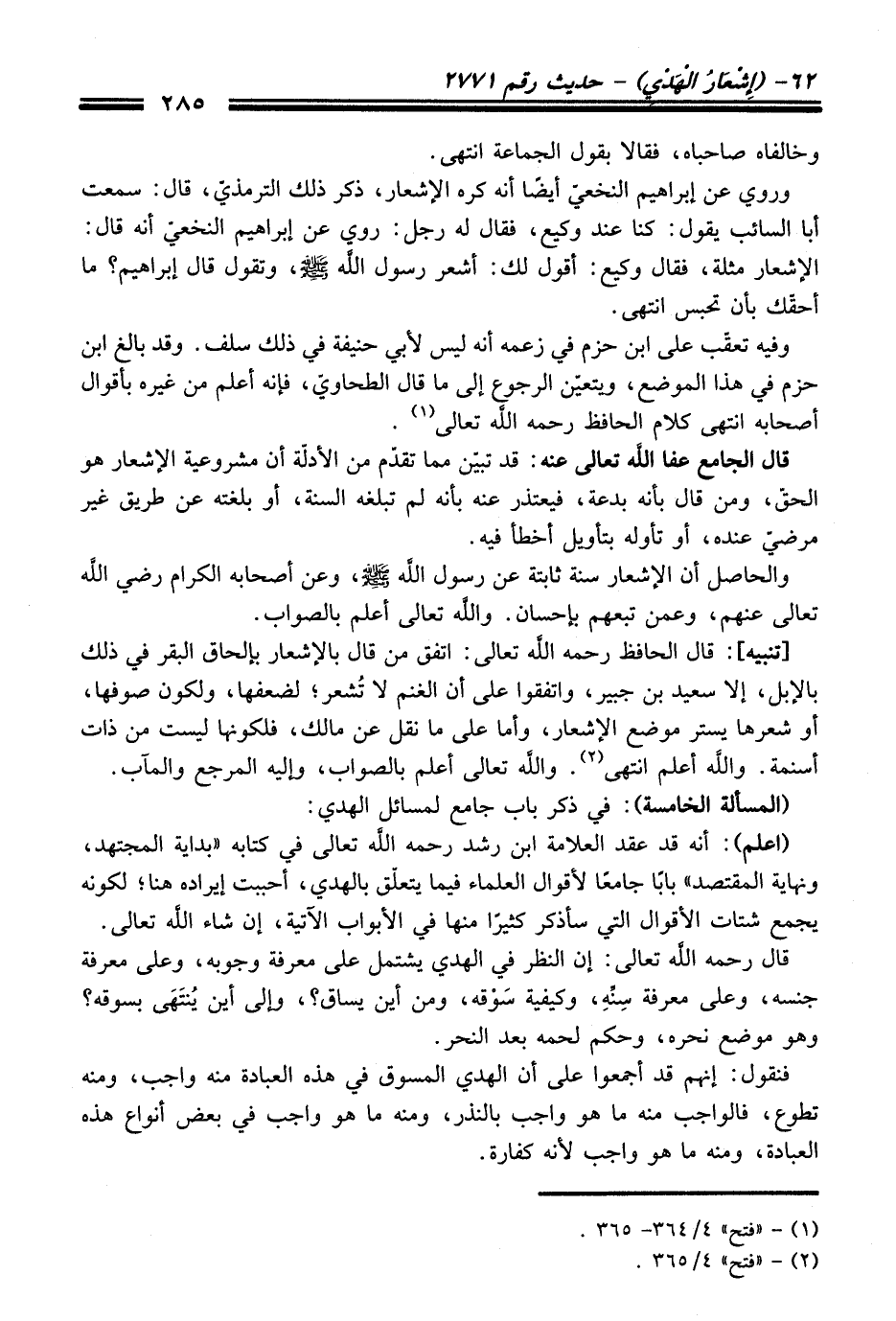 والحاصل أن الإشعار سنة ثابتة عن رسول اللَّه - صلى اللَّه عليه وسلم -، وعن أصحابه الكرام رضي اللَّه تعالى عنهم، وعمن تبعهم بإحسان. واللَّه تعالى أعلم بالصواب.