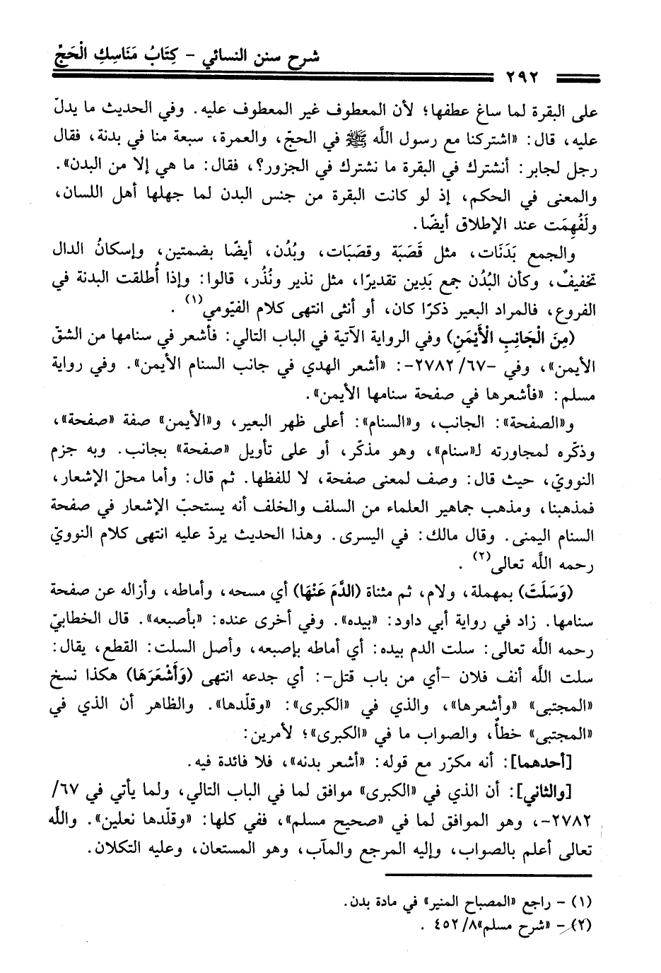 [والثاني]: أن الذي في "الكبرى" موافق لما في الباب التالي، ولما يأتي في 67/ 2782 - ، وهو الموافق لما في "صحيح مسلم"، ففي كلها: "وقلّدها نعلين". واللَّه تعالى أعلم بالصواب، وإليه المرجع والمآب، وهو المستعان، وعليه التكلان.