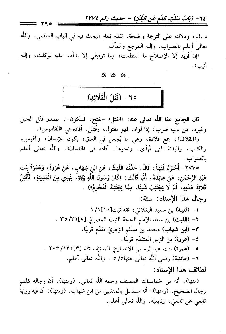 2775 - (أَخْبَرَنَا قُتَيْبَةُ, قَالَ: حَدَّثَنَا اللَّيْثُ, عَنِ ابْنِ شِهَابٍ, عَنْ عُرْوَةَ, وَعَمْرَةَ بِنْتِ عَبْدِ الرَّحْمَنِ, عَنْ عَائِشَةَ, أَنَّهَا قَالَتْ: "كَانَ رَسُولُ اللَّهِ - صلى اللَّه عليه وسلم -, يُهْدِى مِنَ الْمَدِينَةِ, فَأَفْتِلُ قَلاَئِدَ هَدْيِهِ, ثُمَّ لاَ يَجْتَنِبُ شَيْئًا, مِمَّا يَجْتَنِبُهُ الْمُحْرِمُ").
