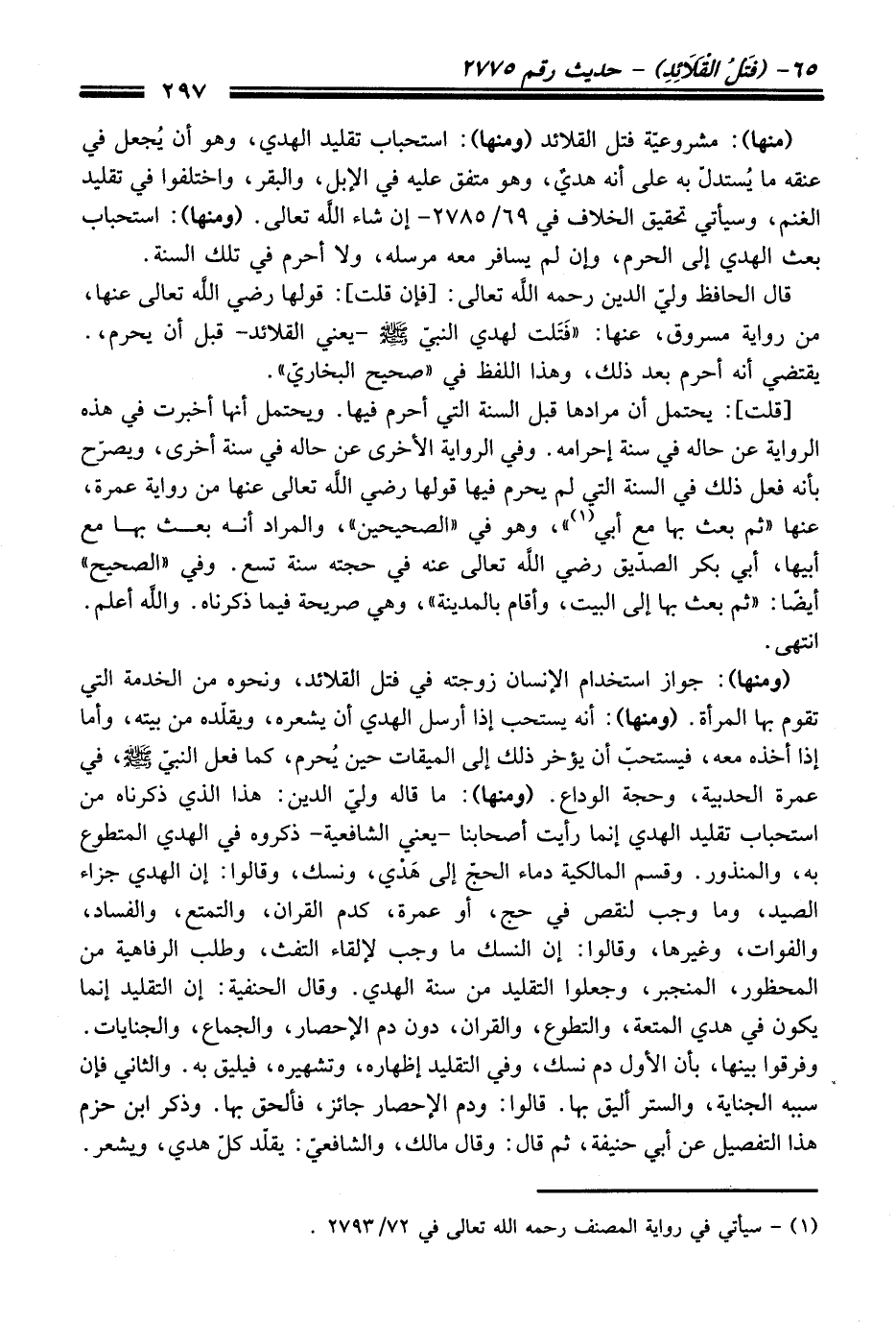 (منها): مشروعيّة فتل القلائد (ومنها): استحباب تقليد الهدي، وهو أن يُجعل في عنقه ما يُستدلّ به على أنه هديٌ، وهو متفق عليه في الإبل، والبقر، واختلفوا في تقليد الغنم، وسيأتي تحقيق الخلاف في 69/ 2785 - إن شاء اللَّه تعالى. (ومنها): استحباب بعث الهدي إلى الحرم، وإن لم يسافر معه مرسله، ولا أحرم في تلك السنة.