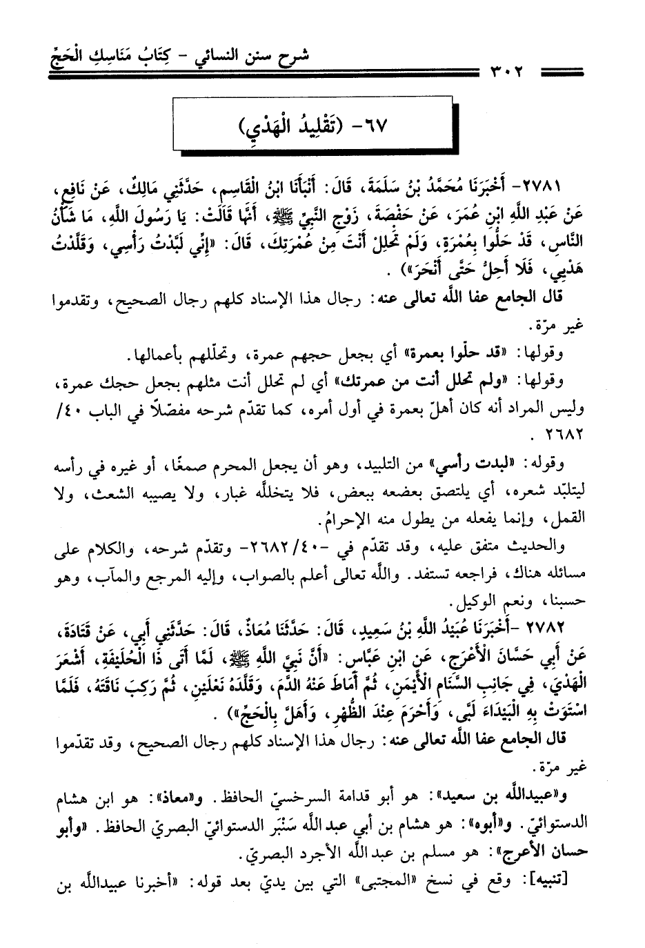 2781 - (أَخْبَرَنَا مُحَمَّدُ بْنُ سَلَمَةَ, قَالَ: أَنْبَأَنَا ابْنُ الْقَاسِمِ, حَدَّثَنِي مَالِكٌ, عَنْ نَافِعٍ,, عَنْ عَبْدِ اللَّهِ بْنِ عُمَرَ, عَنْ حَفْصَةَ, زَوْجِ النَّبِيِّ - صلى اللَّه عليه وسلم -, أَنَّهَا قَالَتْ: يَا رَسُولَ اللَّهِ, مَا شَأْنُ النَّاسِ, قَدْ حَلُّوا بِعُمْرَةٍ, وَلَمْ تَحْلِلْ أَنْتَ مِنْ عُمْرَتِكَ, قَالَ: «إِنِّي لَبَّدْتُ رَأْسِي, وَقَلَّدْتُ هَدْيِي, فَلاَ أَحِلُّ حَتَّى أَنْحَرَ»).