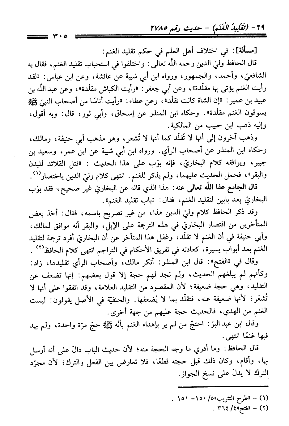وقد ذكر الحافظ كلام وليّ الدين هذا، من غير تصريح باسمه، فقال: أخذ بعض المتأخرين من اقتصار البخاريّ في هذه الترجمة على الإبل، والبقر أنه موافق لمالك، وأبي حنيفة في أن الغنم لا تقلّد، وغفل هذا المتأخر عن أن البخاريّ أفرد ترجمة لتقليد الغنم بعد أبواب يسيرة، كعادته في تفريق الأحكام في التراجم انتهى كلام الحافظ (¬2).