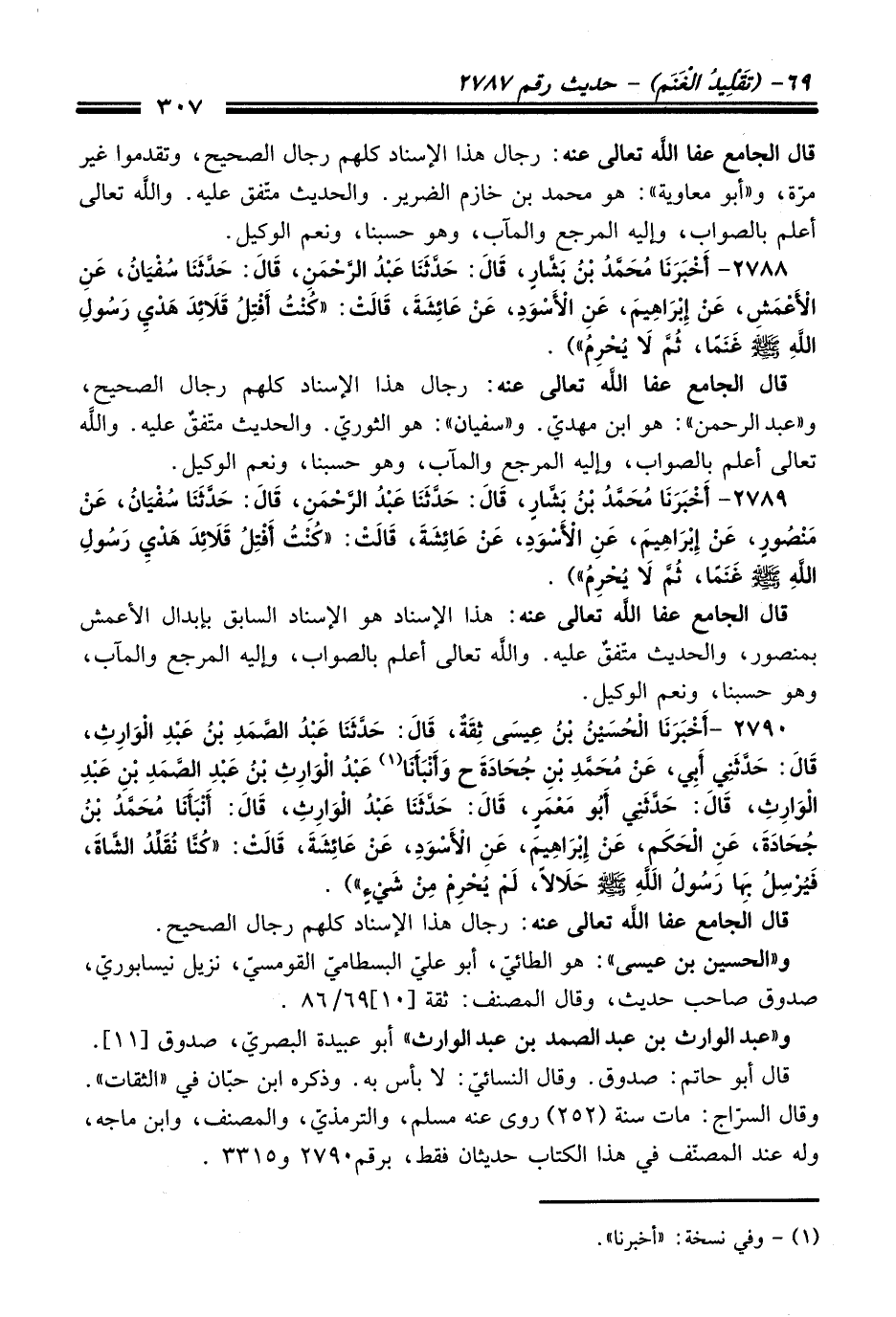 2790 - (أَخْبَرَنَا الْحُسَيْنُ بْنُ عِيسَى ثِقَةٌ, قَالَ: حَدَّثَنَا عَبْدُ الصَّمَدِ بْنُ عَبْدِ الْوَارِثِ, قَالَ: حَدَّثَنِي أَبِي, عَنْ مُحَمَّدِ بْنِ جُحَادَةَ ح وَأَنْبَأَنَا (¬1) عَبْدُ الْوَارِثِ بْنُ عَبْدِ الصَّمَدِ بْنِ عَبْدِ الْوَارِثِ, قَالَ: حَدَّثَنِي أَبُو مَعْمَرٍ, قَالَ: حَدَّثَنَا عَبْدُ الْوَارِثِ, قَالَ: أَنْبَأَنَا مُحَمَّدُ بْنُ جُحَادَةَ, عَنِ الْحَكَمِ, عَنْ إِبْرَاهِيمَ, عَنِ الأَسْوَدِ, عَنْ عَائِشَةَ, قَالَتْ: "كُنَّا نُقَلِّدُ الشَّاةَ, فَيُرْسِلُ بِهَا رَسُولُ اللَّهِ - صلى اللَّه عليه وسلم - حَلاَلاً, لَمْ يُحْرِمْ مِنْ شَيْءٍ").
