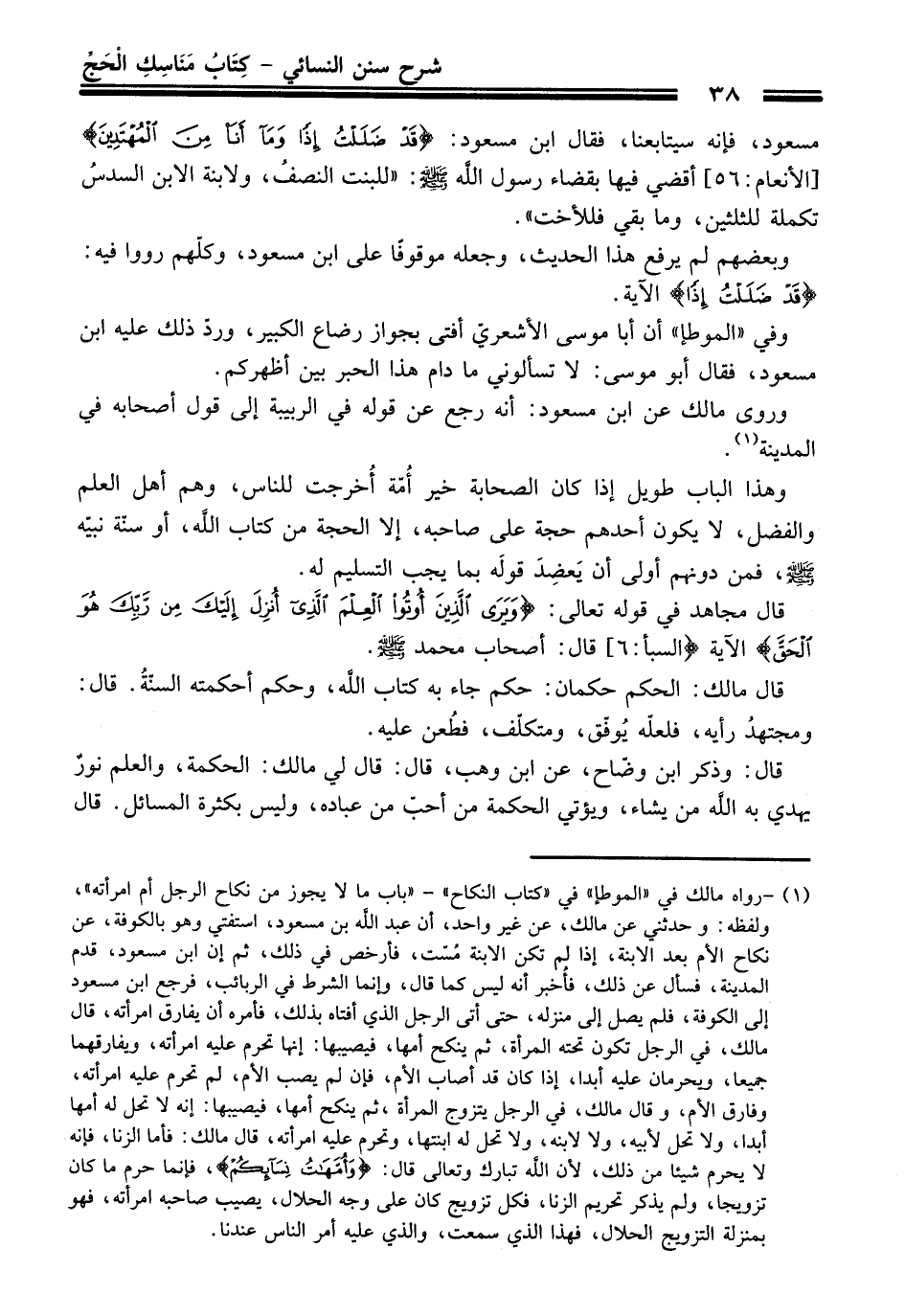 (¬1) - رواه مالك في "الموطإ" في "كتاب النكاح" - "باب ما لا يجوز من نكاح الرجل أم امرأته"، ولفظه: وحدثني عن مالك، عن غير واحد، أن عبد اللَّه بن مسعود، استفتي وهو بالكوفة، عن نكاح الأم بعد الابنة، إذا لم تكن الابنة مُسّت، فأرخص في ذلك، ثم إن ابن مسعود، قدم المدينة، فسأل عن ذلك، فأخبر أنه ليس كما قال، وإنما الشرط في الربائب، فرجع ابن مسعود إلى الكوفة، فلم يصل إلى منزله، حتى أتى الرجل الذي أفتاه بذلك، فأمره أن يفارق امرأته، قال مالك، في الرجل تكون تحته المرأة، ثم ينكح أمها، فيصيبها: إنها تحرم عليه امرأته، ويفارقهما جميعًا، ويحرمان عليه أبدا، إذا كان قد أصاب الأم، فإن لم يصب الأم، لم تحرم عليه امرأته، وفارق الأم، وقال مالك، في الرجل يتزوج المرأة، ثم ينكح أمها، فيصيبها: إنه لا تحل له أمها أبدا, ولا تحل لأبيه، ولا لابنه، ولا تحل له ابنتها، وتحرم عليه امرأته، قال مالك: فأما الزنا، فإنه لا يحرم شيئًا من ذلك, لأن اللَّه تبارك وتعالى قال: {وَأُمَّهَاتُ نِسَائِكُمْ}، فإنما حرم ما كان تزويجا, ولم يذكر تحريم الزنا، فكل تزويج كان على وجه الحلال، يصيب صاحبه امرأته، فهو بمنزلة التزويج الحلال، فهذا الذي سمعت، والذي عليه أمر الناس عندنا.