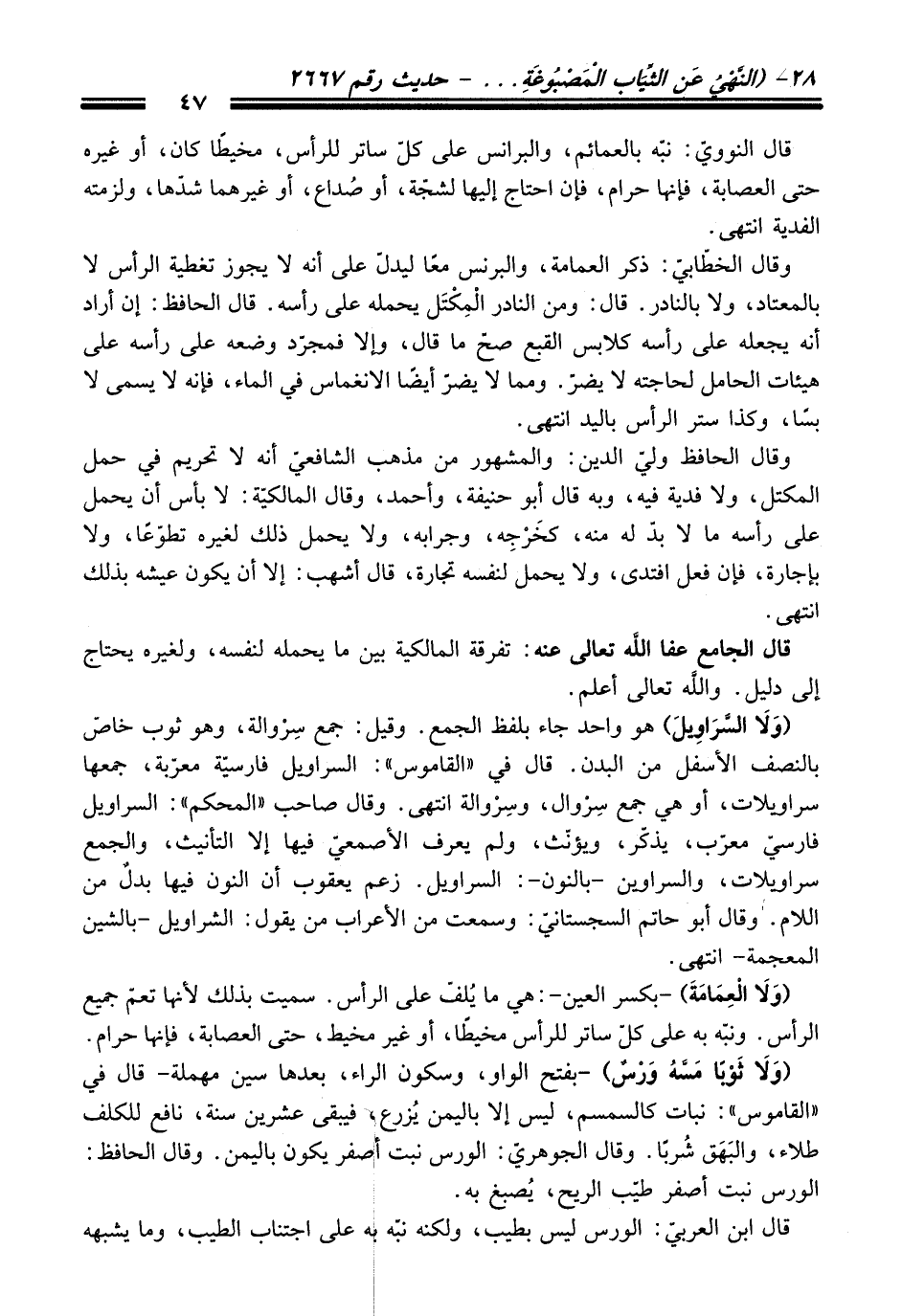 قال النوويّ: نبّه بالعمائم، والبرانس على كلّ ساتر للرأس، مخيطًا كان، أو غيره حتى العصابة، فإنها حرام، فإن احتاج إليها لشجّة، أو صُداع، أو غيرهما شدّها, ولزمته الفدية انتهى.