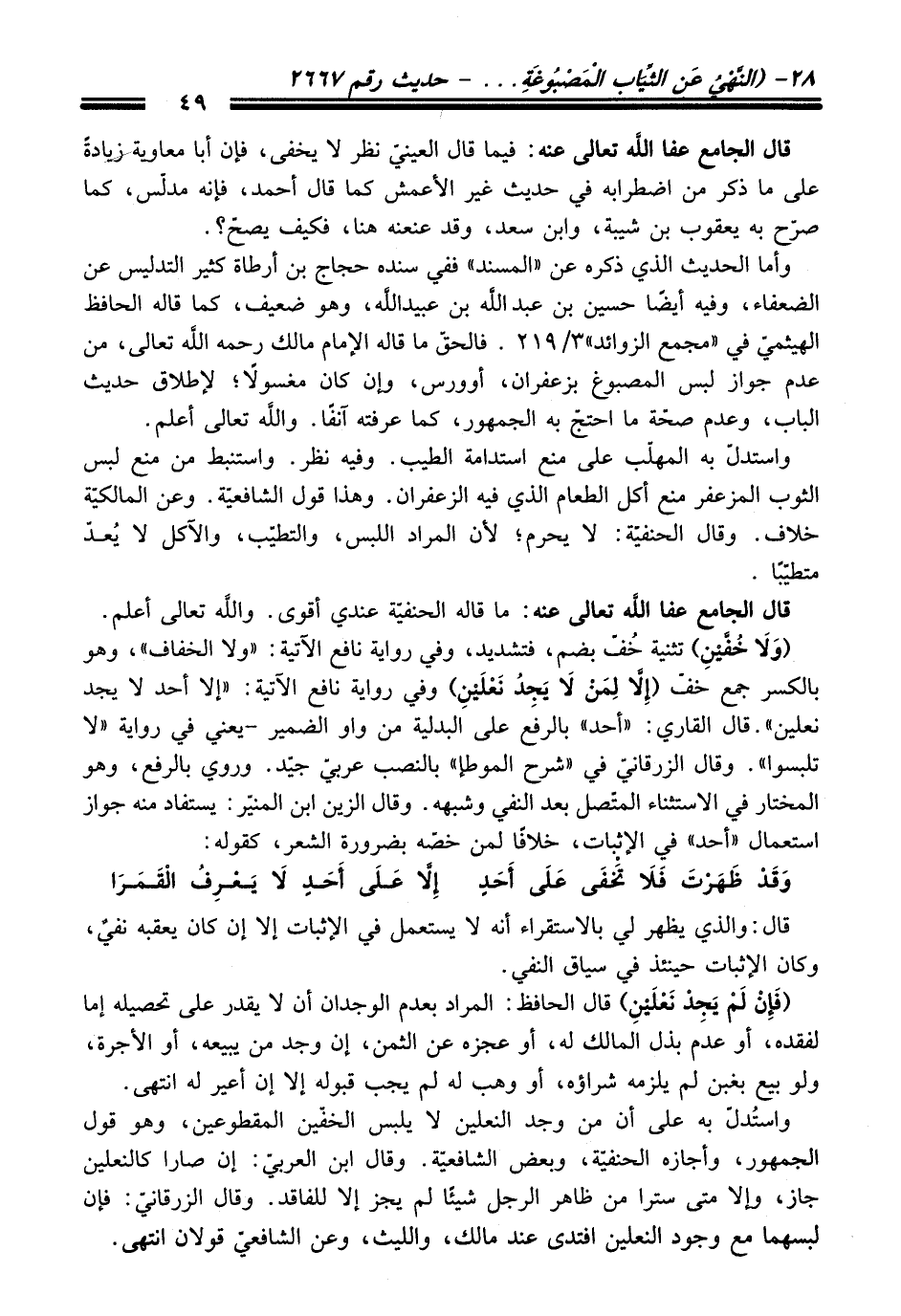 وأما الحديث الذي ذكره عن "المسند" ففي سنده حجاج بن أرطاة كثير التدليس عن الضعفاء وفيه أيضًا حسين بن عبد اللَّه بن عبيد اللَّه، وهو ضعيف، كما قاله الحافظ الهيثمي في "مجمع الزوائد" 3/ 219. فالحقّ ما قاله الإمام مالك -رحمه اللَّه تعالى-، من عدم جواز لبس المصبوغ بزعفران، أوورس، وإن كان مغسولاً؛ لإطلاق حديث الباب، وعدم صحّة ما احتجّ به الجمهور، كما عرفته آنفًا. واللَّه تعالى أعلم.
