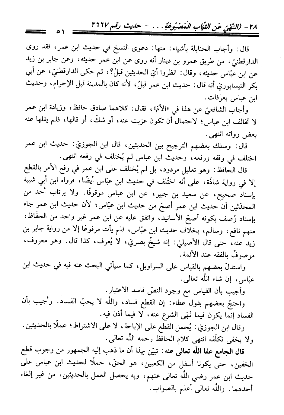 قال الحافظ: وهو تعليل مردود، بل لم يُختلف على ابن عمر في رفع الأمر بالقطع إلا في رواية شاذّة، على أنه اختُلف في حديث ابن عبّاس أيضًا، فرواه ابن أبي شيبة بإسناد صحيح، عن سعيد بن جبير، عن ابن عباس موقوفًا. ولا يرتاب أحد من المحدّثين أن حديث ابن عمر أصحّ من حديث ابن عبّاس؛ لأن حديث ابن عمر جاء بإسناد وُصف بكونه أصحّ الأسانيد، واتفق عليه عن ابن عمر غير واحد من الحفّاظ، منهم نافع، وسالم، بخلاف حديث ابن عبّاس، فلم يأت مرفوعًا إلا من رواية جابر بن زيد عنه، حتى قال الأصيليّ: إنه شيخٌ بصريّ، لا يُعرف، كذا قال. وهو معروف، موصوفٌ بالفقه عند الأئمة.
