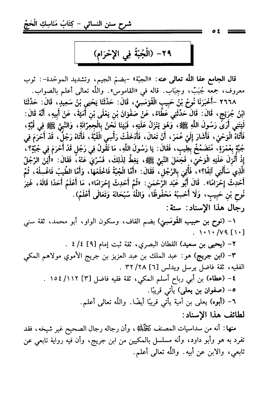 2668 - (أَخْبَرَنَا نُوحُ بْنُ حَبِيبٍ الْقُومَسِيُّ, قَالَ: حَدَّثَنَا يَحْيَى بْنُ سَعِيدٍ, قَالَ: حَدَّثَنَا ابْنُ جُرَيْجٍ, قَالَ: حَدَّثَنِي عَطَاءٌ, عَنْ صَفْوَانَ بْنِ يَعْلَى بْنِ أُمَيَّةَ, عَنْ أَبِيهِ, أَنَّهُ قَالَ: لَيْتَنِي أَرَى رَسُولَ اللَّهِ - صلى اللَّه عليه وسلم -, وَهُوَ يُنْزَلُ عَلَيْهِ, فَبَيْنَا نَحْنُ بِالْجِعِرَّانَةِ, وَالنَّبِيُّ - صلى اللَّه عليه وسلم - فِي قُبَّةٍ, فَأَتَاهُ الْوَحْيُ, فَأَشَارَ إِلَيَّ عُمَرُ, أَنْ تَعَالَ, فَأَدْخَلْتُ رَأْسِي الْقُبَّةَ, فَأَتَاهُ رَجُلٌ, قَدْ أَحْرَمَ فِي جُبَّةٍ بِعُمْرَةٍ, مُتَضَمِّخٌ بِطِيبٍ, فَقَالَ: يَا رَسُولَ اللَّهِ, مَا تَقُولُ فِي رَجُلٍ قَدْ أَحْرَمَ فِي جُبَّةٍ؟ , إِذْ أُنْزِلَ عَلَيْهِ الْوَحْيُ, فَجَعَلَ النَّبِيُّ - صلى اللَّه عليه وسلم -, يَغِطُّ لِذَلِكَ, فَسُرِّيَ عَنْهُ, فَقَالَ: «أَيْنَ الرَّجُلُ الَّذِي سَأَلَنِي آنِفًا؟» , فَأُتِيَ بِالرَّجُلِ, فَقَالَ: «أَمَّا الْجُبَّةُ فَاخْلَعْهَا, وَأَمَّا الطِّيبُ فَاغْسِلْهُ, ثُمَّ أَحْدِثْ إِحْرَامًا» , قَالَ أَبُو عَبْدِ الرَّحْمَنِ: «ثُمَّ أَحْدِثْ إِحْرَامًا» , مَا أَعْلَمُ أَحَدًا قَالَهُ, غَيْرَ نُوحِ بْنِ حَبِيبٍ, وَلاَ أَحْسِبُهُ مَحْفُوظًا, وَاللَّهُ سُبْحَانَهُ وَتَعَالَى أَعْلَمُ).
