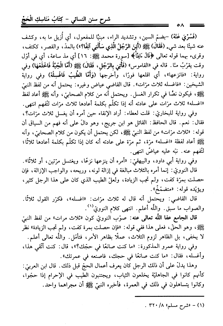 وفي رواية عمرو المذكورة: "ما كنت صائغًا في حجّك؟ "، قال: كنت أتّقي هذا، وأغسله، فقال: "ما كنت صائغًا في حجك، فاصنعه في عمرتك".
