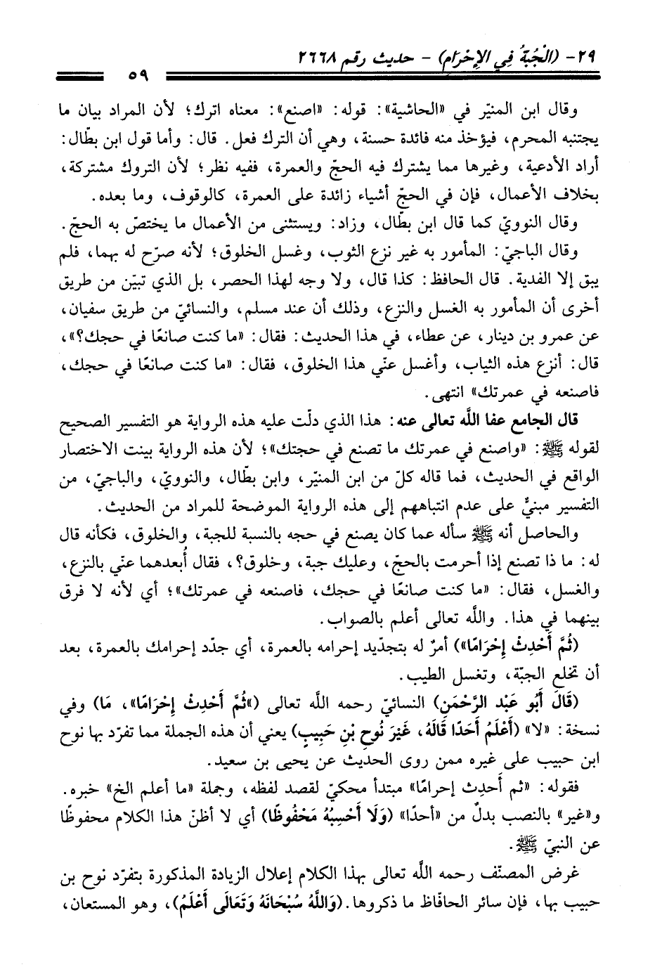 قال الجامع - عفا اللَّه تعالى عنه -: هذا الذي دلّت عليه هذه الرواية هو التفسير الصحيح لقوله - صلى اللَّه عليه وسلم -: "واصنع في عمرتك ما تصنع في حجتك"؛ لأن هذه الرواية بينت الاختصار الواقع في الحديث، فما قاله كلّ من ابن المنيّر، وابن بطّال، والنوويّ، والباجيّ، من التفسير مبنيَّ على عدم انتباههم إلى هذه الرواية الموضحة للمراد من الحديث.