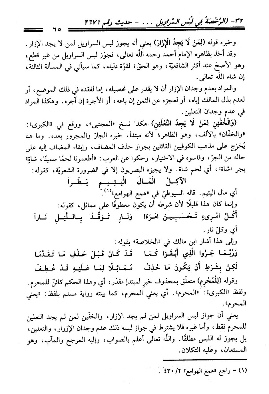 وخبره قوله (لِمَنْ لَا يَجِدُ الإِزَارَ) يعني أنه يجوز لبس السراويل لمن لا يجد الإزار.