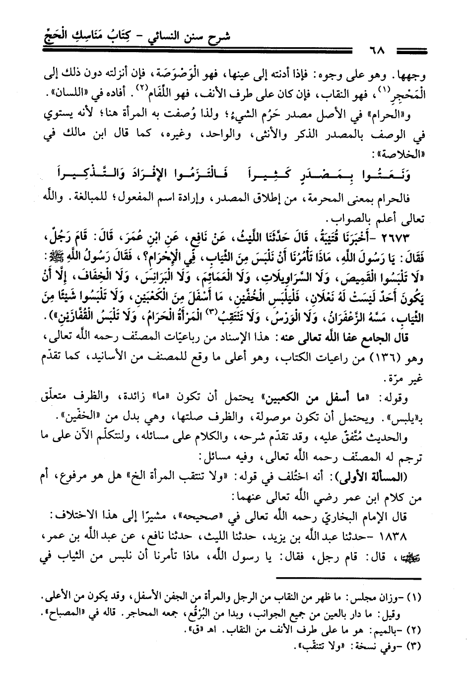 2673 - (أَخْبَرَنَا قُتَيْبَةُ, قَالَ: حَدَّثَنَا اللَّيْثُ, عَنْ نَافِعٍ, عَنِ ابْنِ عُمَرَ, قَالَ: قَامَ رَجُلٌ, فَقَالَ: يَا رَسُولَ اللَّهِ, مَاذَا تَأْمُرُنَا أَنْ نَلْبَسَ مِنَ الثِّيَابِ, فِي الإِحْرَامِ؟ , فَقَالَ رَسُولُ اللَّهِ - صلى اللَّه عليه وسلم -: «لاَ تَلْبَسُوا الْقَمِيصَ, وَلاَ السَّرَاوِيلاَتِ, وَلاَ الْعَمَائِمَ, وَلاَ الْبَرَانِسَ, وَلاَ الْخِفَافَ, إِلاَّ أَنْ يَكُونَ أَحَدٌ لَيْسَتْ لَهُ نَعْلاَنِ, فَلْيَلْبَسِ الْخُفَّيْنِ, مَا أَسْفَلَ مِنَ الْكَعْبَيْنِ, وَلاَ تَلْبَسُوا شَيْئًا مِنَ الثِّيَابِ, مَسَّهُ الزَّعْفَرَانُ, وَلاَ الْوَرْسُ, وَلاَ تَنْتَقِبُ (¬3) الْمَرْأَةُ الْحَرَامُ, وَلاَ تَلْبَسُ الْقُفَّازَيْنِ»).