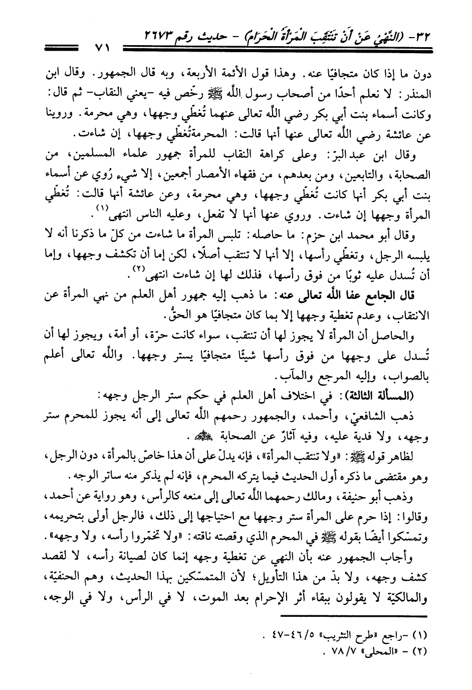 قال الجامع - عفا اللَّه تعالى عنه -: ما ذهب إليه جمهور أهل العلم من نهي المرأة عن الانتقاب، وعدم تغطية وجهها إلا بما كان متجافيًا هو الحقُّ.
