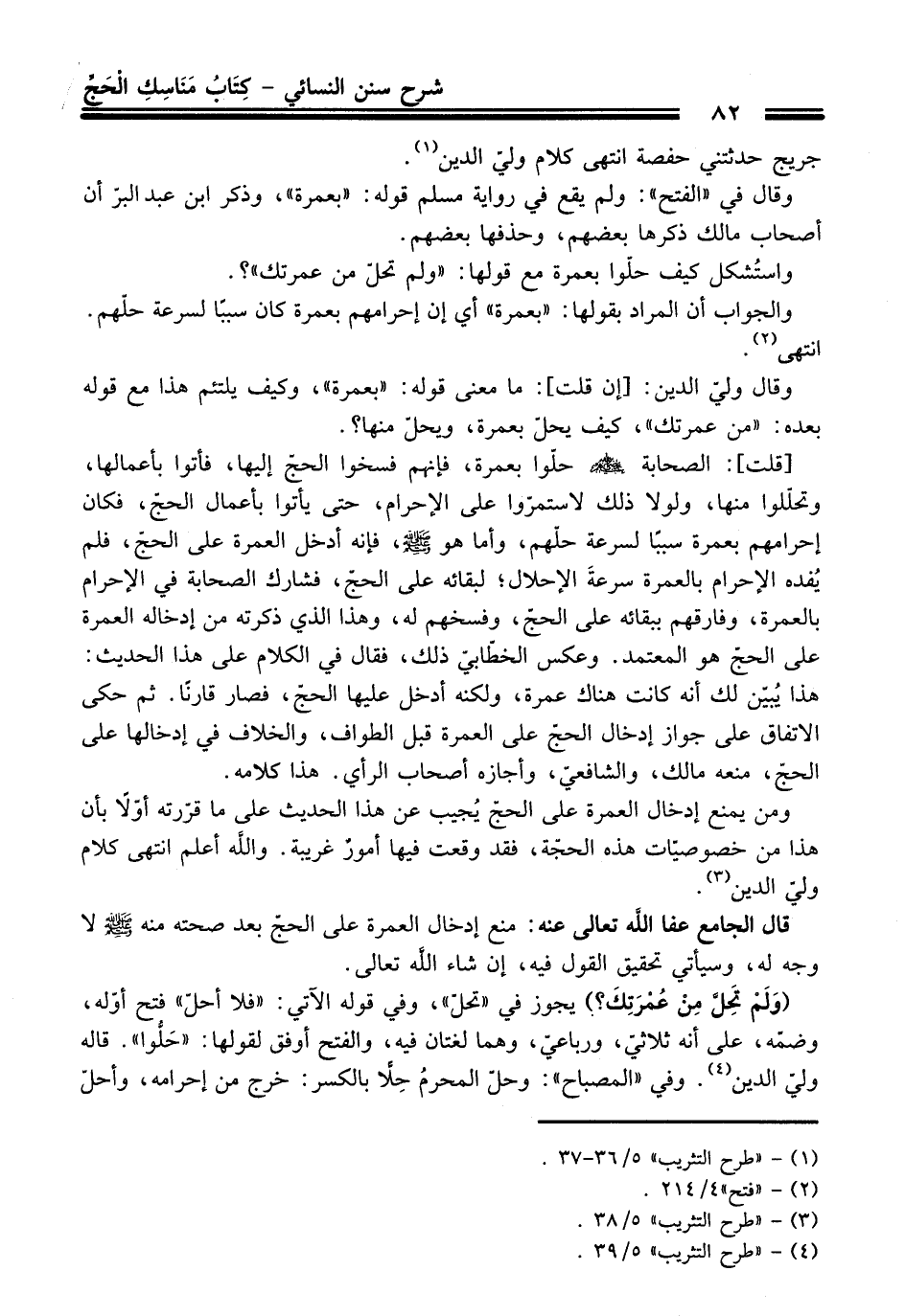 ومن يمنع إدخال العمرة على الحجّ يُجيب عن هذا الحديث على ما قرّرته أولاً بأن هذا من خصوصيّات هذه الحجّة، فقد وقعت فيها أمورٌ غريبة. واللَّه أعلم انتهى كلام وليّ الدين (¬3).