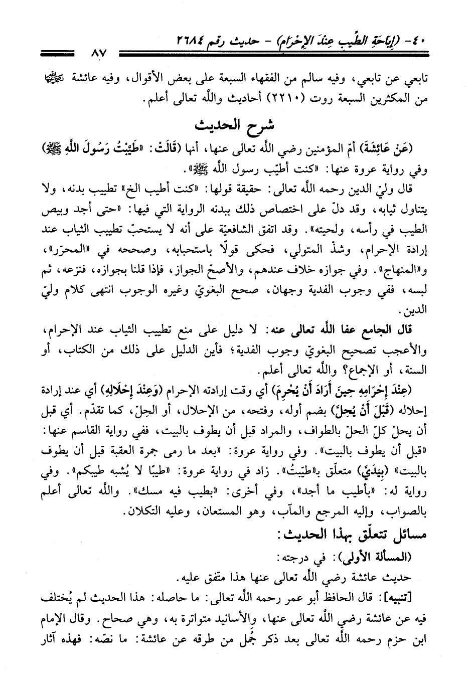 (عَنْ عَائِشَةَ) أمّ المؤمنين - رضي اللَّه تعالى عنها -، أنها (قَالَتْ: "طَيَّبْتُ رَسُولَ اللَّهِ - صلى اللَّه عليه وسلم -) وفي رواية عروة عنها: "كنت أطيّب رسول اللَّه - صلى اللَّه عليه وسلم -".