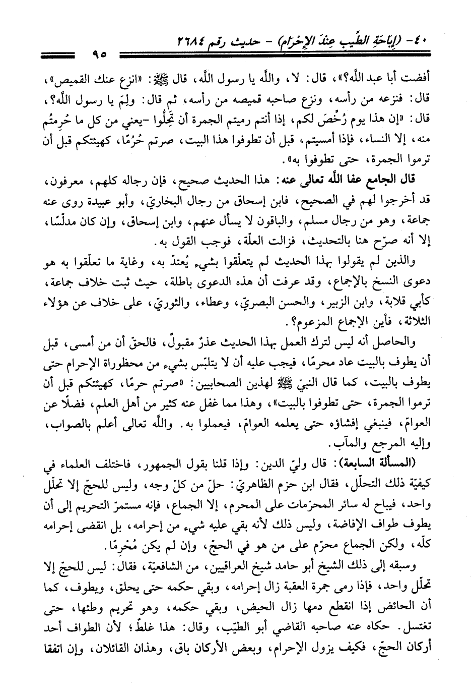 أفضت أبا عبد اللَّه؟ "، قال: لا، واللَّه يا رسول اللَّه، قال - صلى اللَّه عليه وسلم -: "انزع عنك القميص"، قال: فنزعه من رأسه، ونزع صاحبه قميصه من رأسه، ثم قال: ولِمَ يا رسول اللَّه؟، قال: "إن هذا يوم رُخَّصَ لكم، إذا أنتم رميتم الجمرة أن تَحِلُّوا -يعني من كلّ ما حُرِمتُم منه، إلا النساء، فإذا أمسيتم، قبل أن تطوفوا هذا البيت، صرتم حُرُمًا، كهيئتكم قبل أن ترموا الجمرة، حتى تطوفوا به".