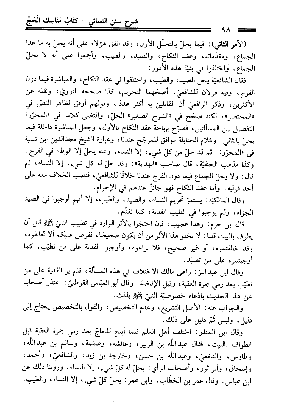 وقال ابن المنذر: اختلف أهل العلم فيما أبيح للحاجّ بعد رمي جمرة العقبة قبل الطواف بالبيت، فقال عبد اللَّه بن الزبير، وعائشة، وعلقمة، وسالم بن عبد اللَّه، وطاوس، والنخعيّ، وعبد اللَّه بن حسن، وخارجة بن زيد، والشافعيّ، وأحمد، وإسحاق، وأبو ثور، وأصحاب الرأي: يحلّ له كلّ شيء، إلا النساء. وروينا ذلك عن ابن عباس. وقال عمر بن الخطّاب، وابن عمر: يحلّ كلّ شيء، إلا النساء، والطيب.
