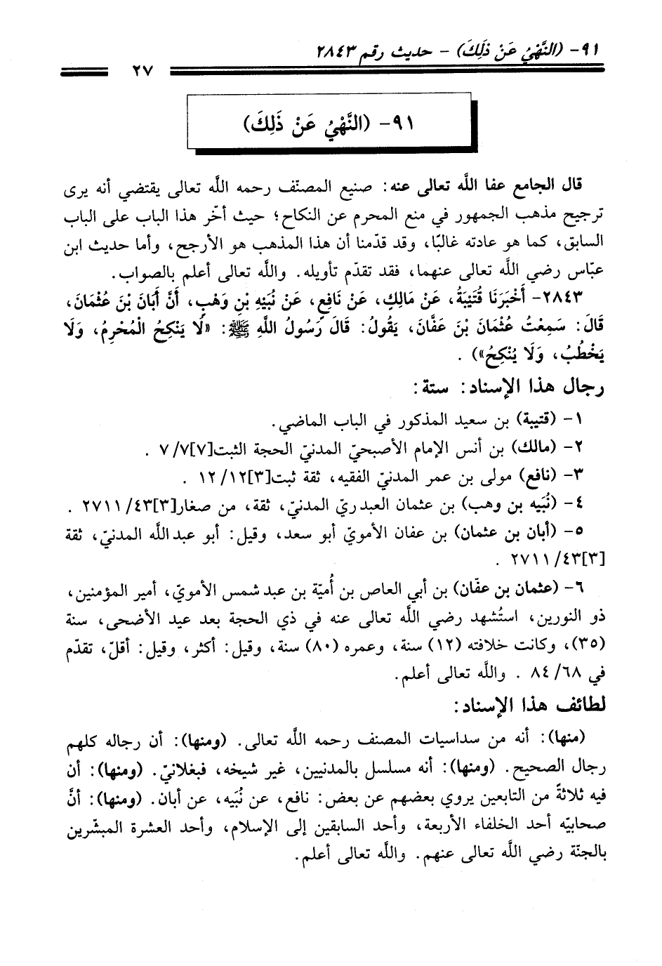 2843 - (أَخْبَرَنَا قُتَيْبَةُ, عَنْ مَالِكٍ, عَنْ نَافِعٍ, عَنْ نُبَيْهِ بْنِ وَهْبٍ, أَنَّ أَبَانَ بْنَ عُثْمَانَ, قَالَ: سَمِعْتُ عُثْمَانَ بْنَ عَفَّانَ, يَقُولُ: قَالَ رَسُولُ اللَّهِ - صلى اللَّه عليه وسلم -: «لاَ يَنْكِحُ الْمُحْرِمُ, وَلاَ يَخْطُبُ, وَلاَ يُنْكِحُ»).
