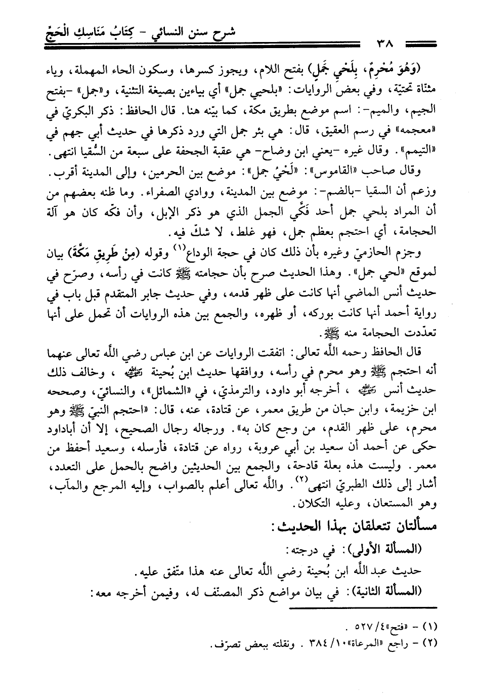 قال الحافظ -رحمه اللَّه تعالى-: اتفقت الروايات عن ابن عباس - رضي اللَّه تعالى عنهما - أنه احتجم - صلى اللَّه عليه وسلم - وهو محرم في رأسه، ووافقها حديث ابن بُحينة - رضي اللَّه عنه -، وخالف ذلك حديث أنس - رضي اللَّه عنه -، أخرجه أبو داود، والترمذيّ، في "الشمائل"، والنسائيّ، وصححه ابن خزيمة، وابن حبان من طريق معمر، عن قتادة، عنه، قال: "احتجم النبيّ - صلى اللَّه عليه وسلم - وهو محرم، على ظهر القدم، من وجع كان به". ورجاله رجال الصحيح، إلا أن أبا داود حكى عن أحمد أن سعيد بن أبي عروبة، رواه عن قتادة، فأرسله، وسعيد أحفظ من معمر. وليست هذه بعلة قادحة، والجمع بين الحديثين واضح بالحمل على التعدد، أشار إلى ذلك الطبريّ انتهى (¬2). واللَّه تعالى أعلم بالصواب، وإليه المرجع والمآب، وهو المستعان، وعليه التكلان.