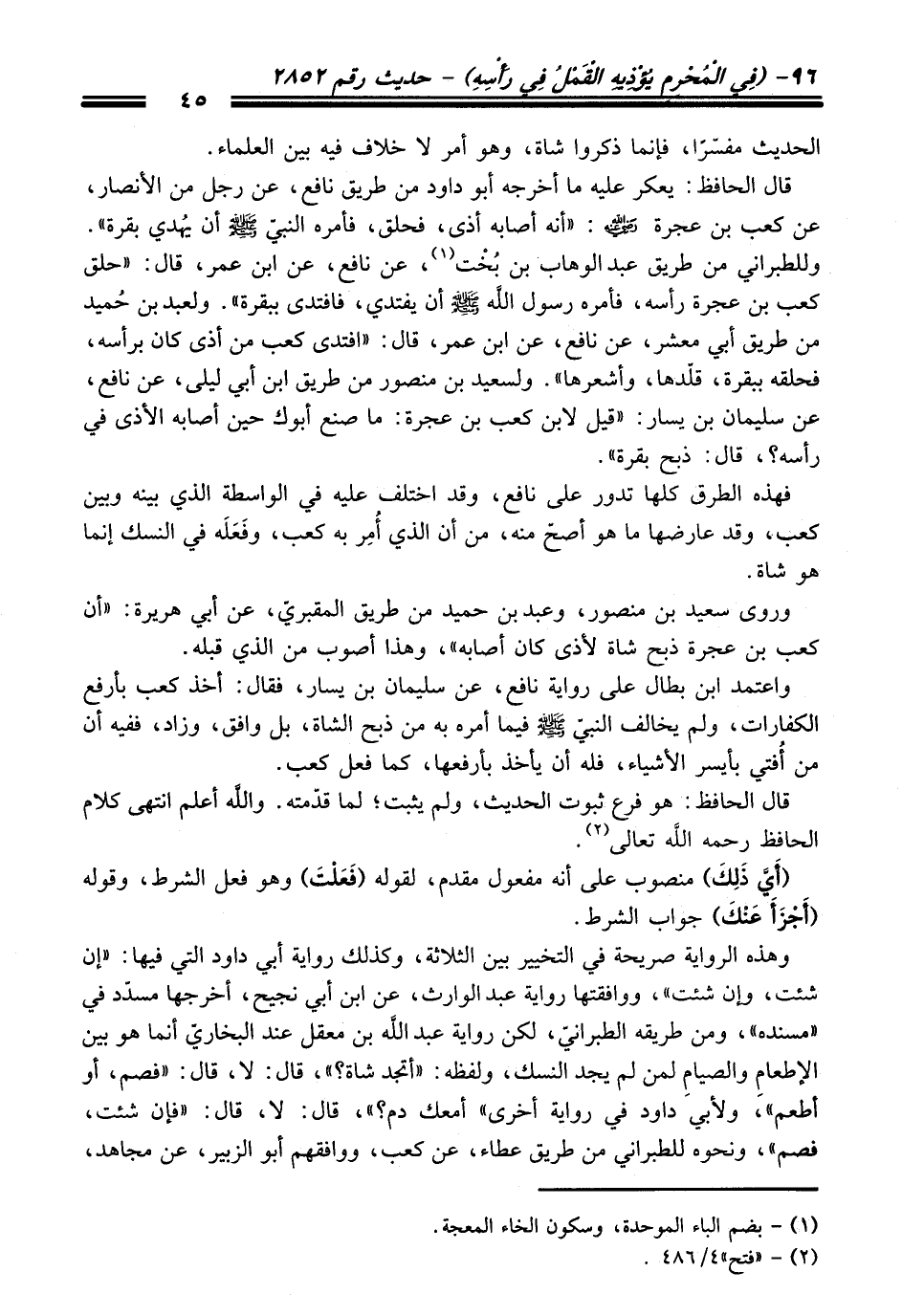 فهذه الطرق كلها تدور على نافع، وقد اختلف عليه في الواسطة الذي بينه وبين كعب، وقد عارضها ما هو أصحّ منه، من أن الذي أُمِر به كعب، وفَعَلَه في النسك إنما هو شاة.