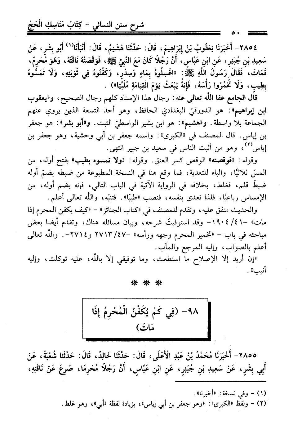 2854 - (أَخْبَرَنَا يَعْقُوبُ بْنُ إِبْرَاهِيمَ, قَالَ: حَدَّثَنَا هُشَيْمٌ, قَالَ: أَنْبَأَنَا (¬1) أَبُو بِشْرٍ, عَنْ سَعِيدِ بْنِ جُبَيْرٍ, عَنِ ابْنِ عَبَّاسٍ, أَنَّ رَجُلاً كَانَ مَعَ النَّبِيِّ - صلى اللَّه عليه وسلم -, فَوَقَصَتْهُ نَاقَتُهُ, وَهُوَ مُحْرِمٌ, فَمَاتَ, فَقَالَ رَسُولُ اللَّهِ - صلى اللَّه عليه وسلم -: «اغْسِلُوهُ بِمَاءٍ وَسِدْرٍ, وَكَفِّنُوهُ فِي ثَوْبَيْهِ, وَلاَ تُمِسُّوهُ بِطِيبٍ, وَلاَ تُخَمِّرُوا رَأْسَهُ, فَإِنَّهُ يُبْعَثُ يَوْمَ الْقِيَامَةِ مُلَبِّيًا»).