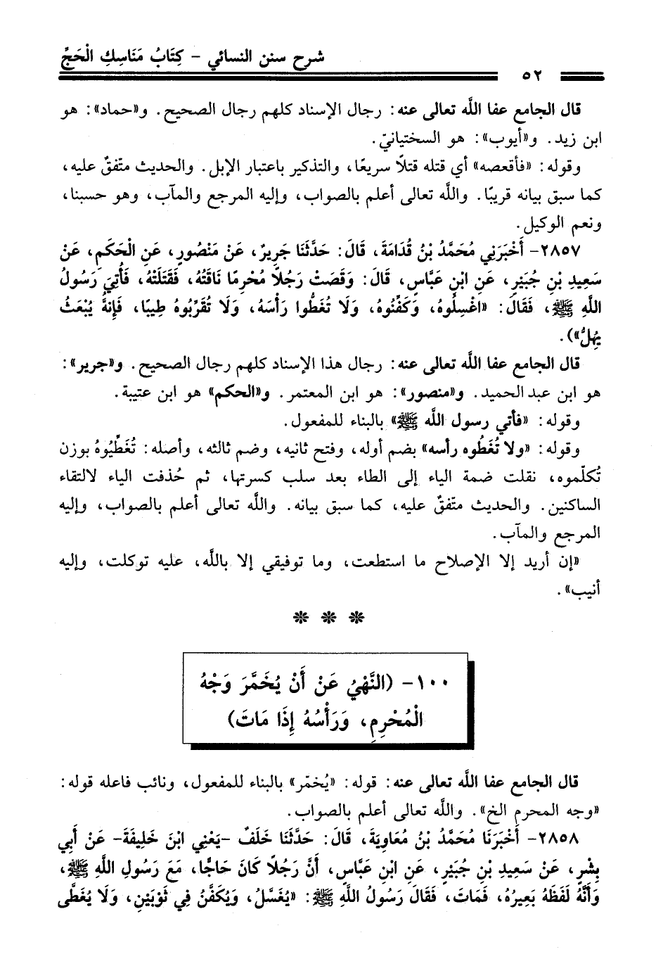 2857 - (أَخْبَرَنِي مُحَمَّدُ بْنُ قُدَامَةَ, قَالَ: حَدَّثَنَا جَرِيرٌ, عَنْ مَنْصُورٍ, عَنِ الْحَكَمِ, عَنْ سَعِيدِ بْنِ جُبَيْرٍ, عَنِ ابْنِ عَبَّاسٍ, قَالَ: وَقَصَتْ رَجُلاً مُحْرِمًا نَاقَتُهُ, فَقَتَلَتْهُ, فَأُتِيَ رَسُولُ اللَّهِ - صلى اللَّه عليه وسلم -, فَقَالَ: «اغْسِلُوهُ, وَكَفِّنُوهُ, وَلاَ تُغَطُّوا رَأْسَهُ, وَلاَ تُقَرِّبُوهُ طِيبًا, فَإِنَّهُ يُبْعَثُ يُهِلُّ»).