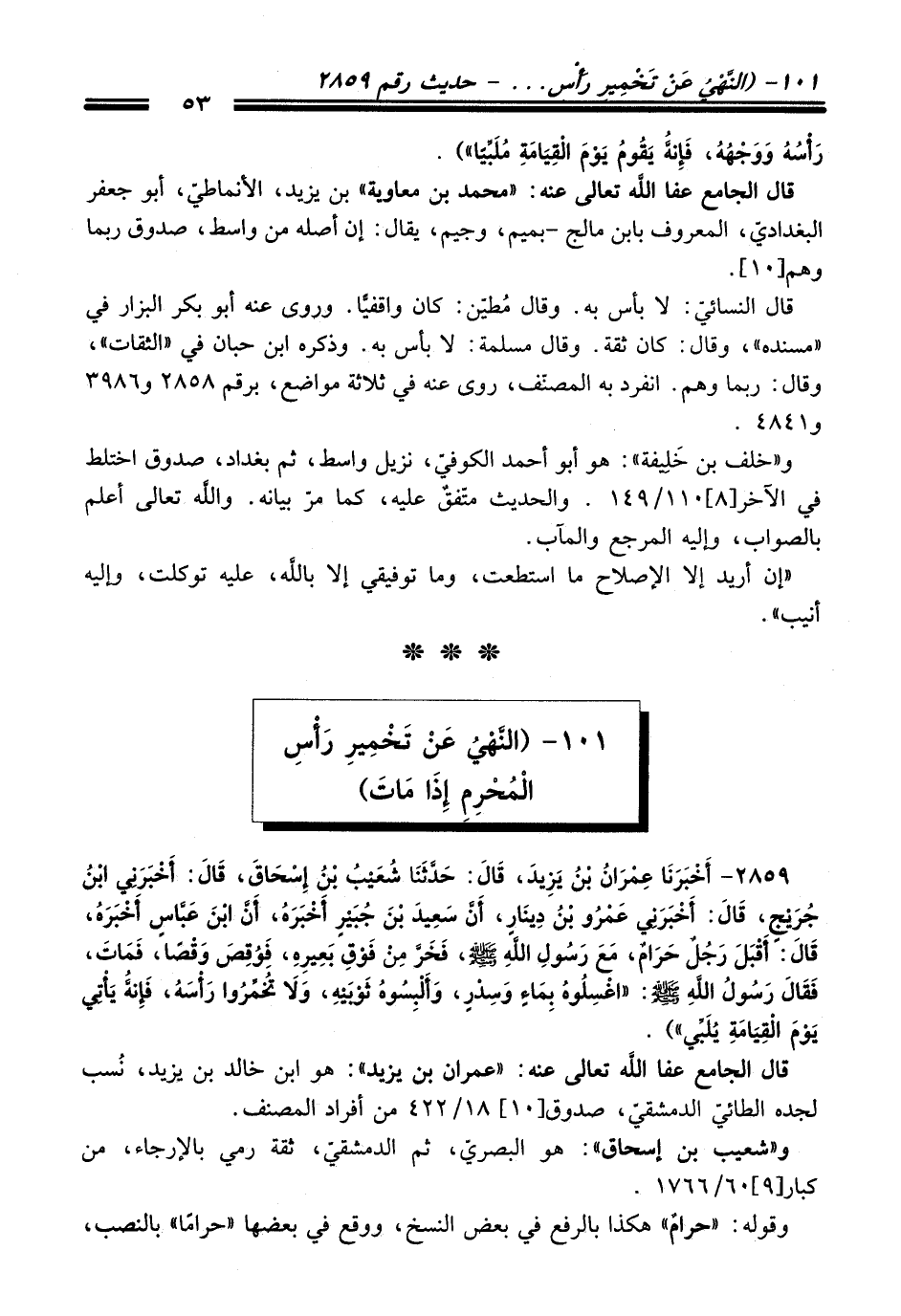 2859 - (أَخْبَرَنَا عِمْرَانُ بْنُ يَزِيدَ, قَالَ: حَدَّثَنَا شُعَيْبُ بْنُ إِسْحَاقَ, قَالَ: أَخْبَرَنِي ابْنُ جُرَيْجٍ, قَالَ: أَخْبَرَنِي عَمْرُو بْنُ دِينَارٍ, أَنَّ سَعِيدَ بْنَ جُبَيْرٍ أَخْبَرَهُ, أَنَّ ابْنَ عَبَّاسٍ أَخْبَرَهُ, قَالَ: أَقْبَلَ رَجُلٌ حَرَامًا, مَعَ رَسُولِ اللَّهِ - صلى اللَّه عليه وسلم -, فَخَرَّ مِنْ فَوْقِ بَعِيرِهِ, فَوُقِصَ وَقْصًا, فَمَاتَ, فَقَالَ رَسُولُ اللَّهِ - صلى اللَّه عليه وسلم -: «اغْسِلُوهُ بِمَاءٍ وَسِدْرٍ, وَأَلْبِسُوهُ ثَوْبَيْهِ, وَلاَ تُخَمِّرُوا رَأْسَهُ, فَإِنَّهُ يَأْتِي يَوْمَ الْقِيَامَةِ يُلَبِّي»).