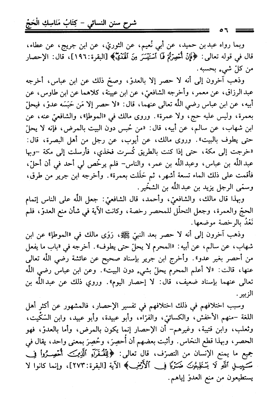 وذهب آخرون إلى أنه لا حصر إلا بالعدوّ، وصح ذلك عن ابن عباس، أخرجه عبد الرزاق، عن معمر، وأخرجه الشافعيّ، عن ابن عيينة، كلاهما عن ابن طاوس، عن أبيه، عن ابن عباس - رضي اللَّه تعالى عنهما -، قال: "لا حصر إلا مَن حَبَسَه عدوّ، فيحلّ بعمرة، وليس عليه حج، ولا عمرة". وروى مالك في "الموطإ"، والشافعيّ عنه، عن ابن شهاب، عن سالم، عن أبيه، قال: "من حُبس دون البيت بالمرض، فإنه لا يحلّ حتى يطوف بالبيت". وروى مالك، عن أيوب، عن رجل من أهل البصرة، قال: "خرجت إلى مكة، حتى إذا كنت بالطريق كُسرت فخذي، فارسلت إلى مكة -وبها عبد اللَّه بن عباس، وعبد اللَّه بن عمر، والناس- فلم يرخّص لي أحد في أن أحلّ، فأقمت على ذلك الماء تسعة أشهر، ثم حَلَلت بعمرة". وأخرجه ابن جرير من طرق، وسمّى الرجل يزيد بن عبد اللَّه بن الشخّير.