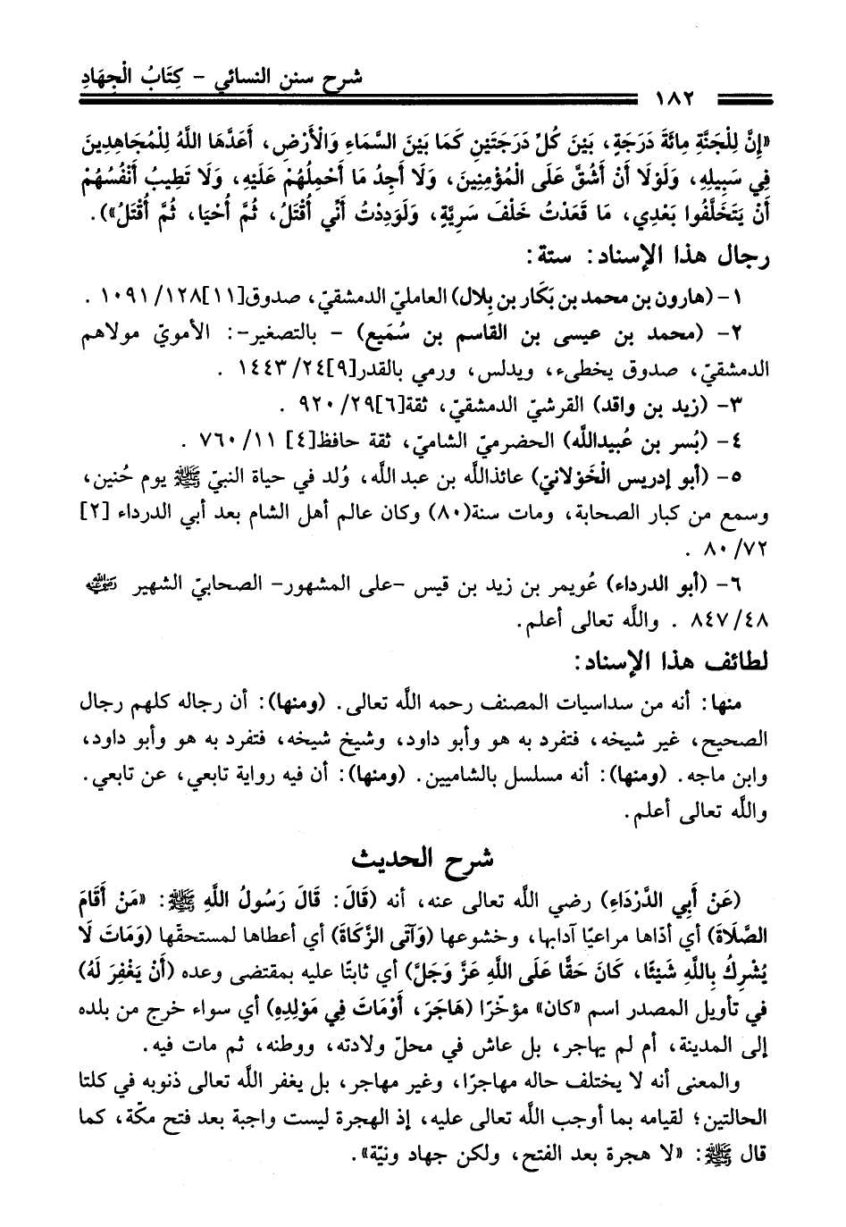 «إِنَّ لِلْجَنَّةِ مِائَةَ دَرَجَةٍ, بَيْنَ كُلِّ دَرَجَتَيْنِ كَمَا بَيْنَ السَّمَاءِ وَالأَرْضِ, أَعَدَّهَا اللَّهُ لِلْمُجَاهِدِينَ فِي سَبِيلِهِ, وَلَوْلاَ أَنْ أَشُقَّ عَلَى الْمُؤْمِنِينَ, وَلاَ أَجِدُ مَا أَحْمِلُهُمْ عَلَيْهِ, وَلاَ تَطِيبُ أَنْفُسُهُمْ أَنْ يَتَخَلَّفُوا بَعْدِي, مَا قَعَدْتُ خَلْفَ سَرِيَّةٍ, وَلَوَدِدْتُ أَنِّي أُقْتَلُ, ثُمَّ أُحْيَا, ثُمَّ أُقْتَلُ»).