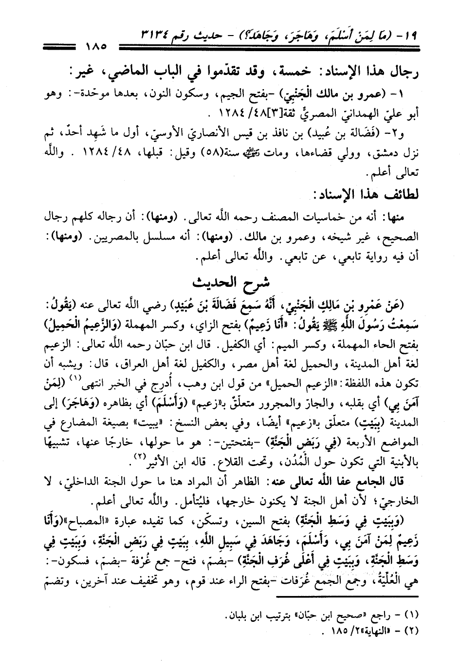 (عَنْ عَمْرِو بْن مَالِك الْجَنْبِيِّ، أَنَّهُ سَمِعَ فَضَالَةَ بْنَ عُبَيْدٍ) - رضي اللَّه تعالى عنه - (يَقُولُ: سَمِعْتُ رَسُولَ اللهِ - صلى اللَّه عليه وسلم - يَقُولُ: "أَنا زَعِيمٌ) بفتح الزاي، وكسر المهملة (وَالزَّعِيمُ الْحَمِيلُ) بفتح الحاء المهملة، وكسر الميم: أي الكفيل. قال ابن حبّان -رحمه اللَّه تعالى-: الزعيم لغة أهل المدينة، والحميل لغة أهل مصر، والكفيل لغة أهل العراق، قال: ويشبه أن تكون هذه اللفظة: "الزعيم الحميل" من قول ابن وهب، أُدرِج في الخبر انتهى (¬1) (لِمَنْ آمَنَ بِي) أي بقلبه، والجارّ والمجرور متعلّقٌ بـ"زعيم" (وَأَسْلَمَ) أي بظاهره (وَهَاجَرَ) إلى المدينة (بِبَيْتٍ) متعلّق بـ"زعيم" أيضًا، وفي بعض النسخ: "يبيت" بصيغة المضارع في المواضع الأربعة (فِي رَبَضِ الْجَنَّةِ) -بفتحتين-: هو ما حولها، خارجًا عنها، تشبيهًا بالأبنية التي تكون حول الْمُدُن، وتحت القلاع. قاله ابن الأثير (¬2).