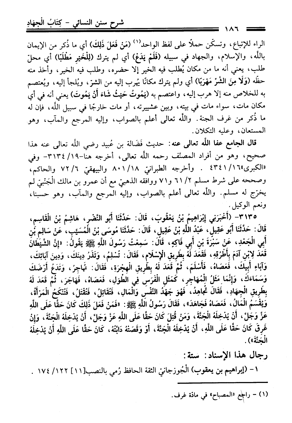 3135 - (أَخْبَرَنِي إِبْرَاهِيمُ بْنُ يَعْقُوبَ, قَالَ: حَدَّثَنَا أَبُو النَّضْرِ, هَاشِمُ بْنُ الْقَاسِمِ, قَالَ: حَدَّثَنَا أَبُو عَقِيلٍ, عَبْدُ اللَّهِ بْنُ عَقِيلٍ, قَالَ: حَدَّثَنَا مُوسَى بْنُ الْمُسَيَّبِ, عَنْ سَالِمِ بْنِ أَبِي الْجَعْدِ, عَنْ سَبْرَةَ بْنِ أَبِي فَاكِهٍ, قَالَ: سَمِعْتُ رَسُولَ اللهِ - صلى اللَّه عليه وسلم - يَقُولُ: «إِنَّ الشَّيْطَانَ قَعَدَ لاِبْنِ آدَمَ بِأَطْرُقِهِ, فَقَعَدَ لَهُ بِطَرِيقِ الإِسْلاَمِ, فَقَالَ: تُسْلِمُ, وَتَذَرُ دِينَكَ, وَدِينَ آبَائِكَ, وَآبَاءِ أَبِيكَ, فَعَصَاهُ, فَأَسْلَمَ, ثُمَّ قَعَدَ لَهُ بِطَرِيقِ الْهِجْرَةِ, فَقَالَ: تُهَاجِرُ, وَتَدَعُ أَرْضَكَ وَسَمَاءَكَ, وَإِنَّمَا مَثَلُ الْمُهَاجِرِ, كَمَثَلِ الْفَرَسِ فِي الطِّوَلِ, فَعَصَاهُ, فَهَاجَرَ, ثُمَّ قَعَدَ لَهُ بِطَرِيقِ الْجِهَادِ, فَقَالَ تُجَاهِدُ, فَهُوَ جَهْدُ النَّفْسِ وَالْمَالِ, فَتُقَاتِلُ, فَتُقْتَلُ, فَتُنْكَحُ الْمَرْأَةُ, وَيُقْسَمُ الْمَالُ, فَعَصَاهُ فَجَاهَدَ» , فَقَالَ رَسُولُ اللَّهِ - صلى اللَّه عليه وسلم -: «فَمَنْ فَعَلَ ذَلِكَ كَانَ حَقًّا عَلَى اللَّهِ -عَزَّ وَجَلَّ-, أَنْ يُدْخِلَهُ الْجَنَّةَ, وَمَنْ قُتِلَ كَانَ حَقًّا عَلَى اللَّهِ -عَزَّ وَجَلَّ-, أَنْ يُدْخِلَهُ الْجَنَّةَ, وَإِنْ غَرِقَ كَانَ حَقًّا عَلَى اللَّهِ, أَنْ يُدْخِلَهُ الْجَنَّةَ, أَوْ وَقَصَتْهُ دَابَّتُهُ, كَانَ حَقًّا عَلَى اللَّهِ أَنْ يُدْخِلَهُ الْجَنَّةَ»).