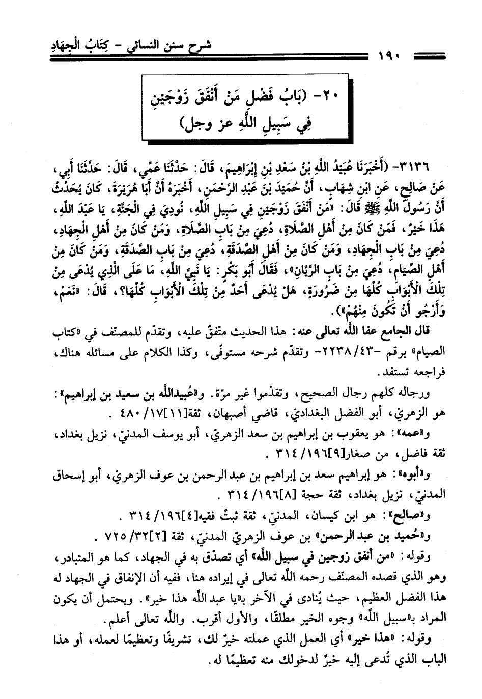 3136 - (أَخْبَرَنَا عُبَيْدُ اللَّهِ بْنُ سَعْدِ بْنِ إِبْرَاهِيمَ, قَالَ: حَدَّثَنَا عَمِّي, قَالَ: حَدَّثَنَا أَبِي, عَنْ صَالِحٍ, عَنِ ابْنِ شِهَابٍ, أَنَّ حُمَيْدَ بْنَ عَبْدِ الرَّحْمَنِ, أَخْبَرَهُ أَنَّ أَبَا هُرَيْرَةَ, كَانَ يُحَدِّثُ أَنَّ رَسُولَ اللهِ - صلى اللَّه عليه وسلم - قَالَ: «مَنْ أَنْفَقَ زَوْجَيْنِ فِي سَبِيلِ اللَّهِ, نُودِيَ فِي الْجَنَّةِ, يَا عَبْدَ اللَّهِ, هَذَا خَيْرٌ, فَمَنْ كَانَ مِنْ أَهْلِ الصَّلاَةِ, دُعِيَ مِنْ بَابِ الصَّلاَةِ, وَمَنْ كَانَ مِنْ أَهْلِ الْجِهَادِ, دُعِيَ مِنْ بَابِ الْجِهَادِ, وَمَنْ كَانَ مِنْ أَهْلِ الصَّدَقَةِ, دُعِيَ مِنْ بَابِ الصَّدَقَةِ, وَمَنْ كَانَ مِنْ أَهْلِ الصِّيَامِ, دُعِيَ مِنْ بَابِ الرَّيَّانِ» , فَقَالَ أَبُو بَكْرٍ: يَا نَبِيَّ اللَّهِ, مَا عَلَى الَّذِي يُدْعَى مِنْ تِلْكَ الأَبْوَابِ كُلِّهَا مِنْ ضَرُورَةٍ, هَلْ يُدْعَى أَحَدٌ مِنْ تِلْكَ الأَبْوَابِ كُلِّهَا؟ , قَالَ: «نَعَمْ, وَأَرْجُو أَنْ تَكُونَ مِنْهُمْ»).