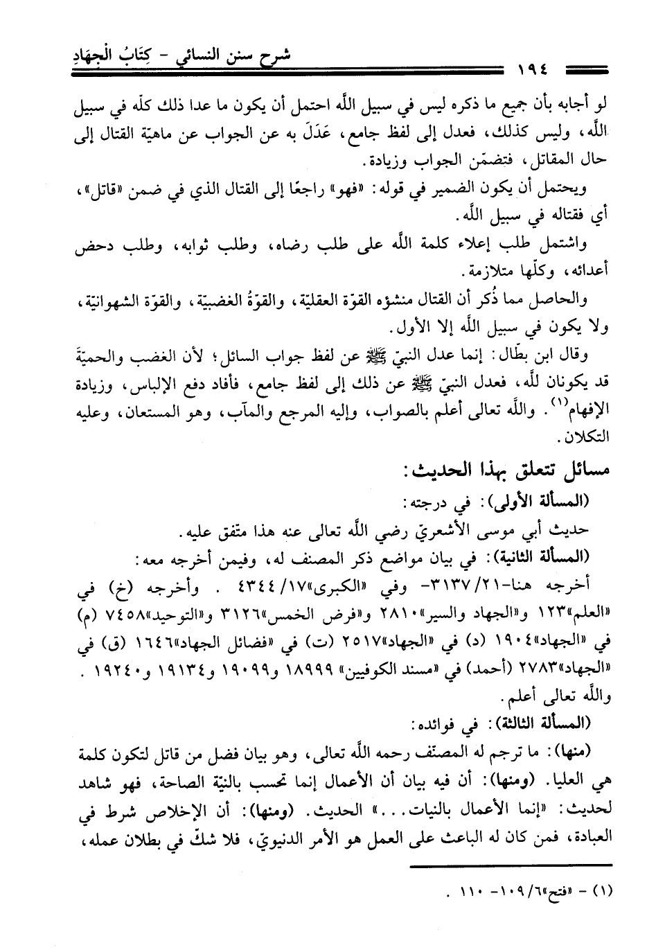 لو أجابه بأن جميع ما ذكره ليس في سبيل اللَّه احتمل أن يكون ما عدا ذلك كلّه في سبيل اللَّه، وليس كذلك، فعدل إلى لفظ جامع، عَدَلَ به عن الجواب عن ماهيّة القتال إلى حال المقاتل، فتضمّن الجواب وزيادة.