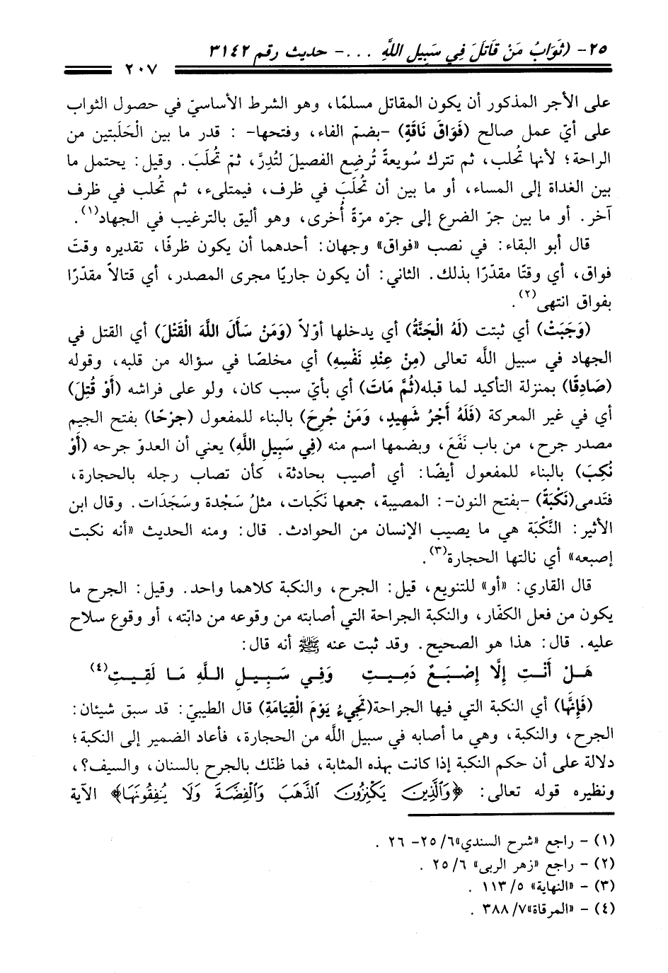 (وَجَبَتْ) أي ثبتت (لَهُ الْجَنَّةُ) أي يدخلها أوّلاً (وَمَنْ سَأَلَ اللَّهَ الْقَتْلَ) أي القتل في الجهاد في سبيل اللَّه تعالى (مِن عِنْدِ نَفْسِهِ) أي مخلصًا في سؤاله من قلبه، وقوله (صَادِقًا) بمنزلة التأكيد لما قبله (ثُمّ مَاتَ) أي بأيّ سبب كان، ولو على فراشه (أَوْ قُتِلَ) أي في غير المعركة (فَلَهُ أَجْرُ شَهِيدٍ، وَمَنْ جُرِحَ) بالبناء للمفعول (جَرْحًا) بفتح الجيم مصدر جرح، من باب نَفَعَ، وبضمها اسم منه (فِي سَبِيلِ اللَّهِ) يعني أن العدوّ جرحه (أَوْ نُكِبَ) بالبناء للمفعول أيضًا: أي أصيب بحادثة، كأن تصاب رجله بالحجارة، فتَدمى (نَكْبَةً) -بفتح النون-: المصيبة، جمعها نَكَبات، مثلُ سَجْدة وسَجَدَات. وقال ابن الأثير: النَّكْبَة هي ما يصيب الإنسان من الحوادث. قال: ومنه الحديث "أنه نكبت إصبعه" أي نالتها الحجارة (¬3).