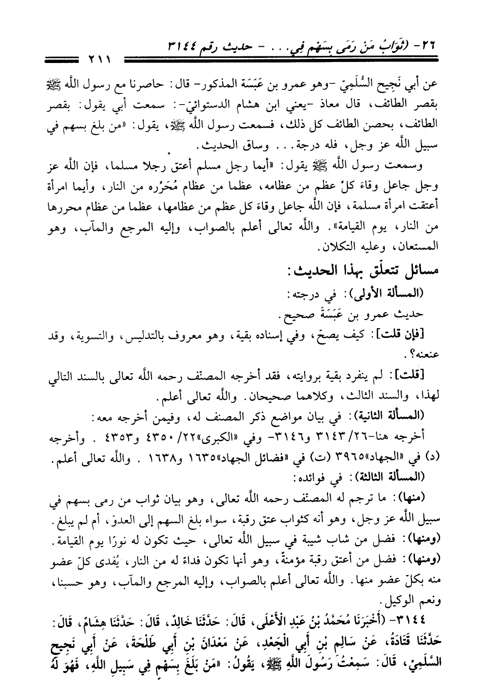عن أبي نَجِيح السُّلَمِيّ -وهو عمرو بن عَبَسَة المذكور- قال: حاصرنا مع رسول اللَّه - صلى اللَّه عليه وسلم - بقصر الطائف، قال معاذ -يعني ابن هشام الدستوائيّ-: سمعت أبي يقول. بقصر الطائف، بحصن الطائف كلّ ذلك، فسمعت رسول اللَّه - صلى اللَّه عليه وسلم -، يقول: "من بلغ بسهم في سبيل اللَّه -عَزَّ وَجَلَّ-، فله درجة ... وساق الحديث.