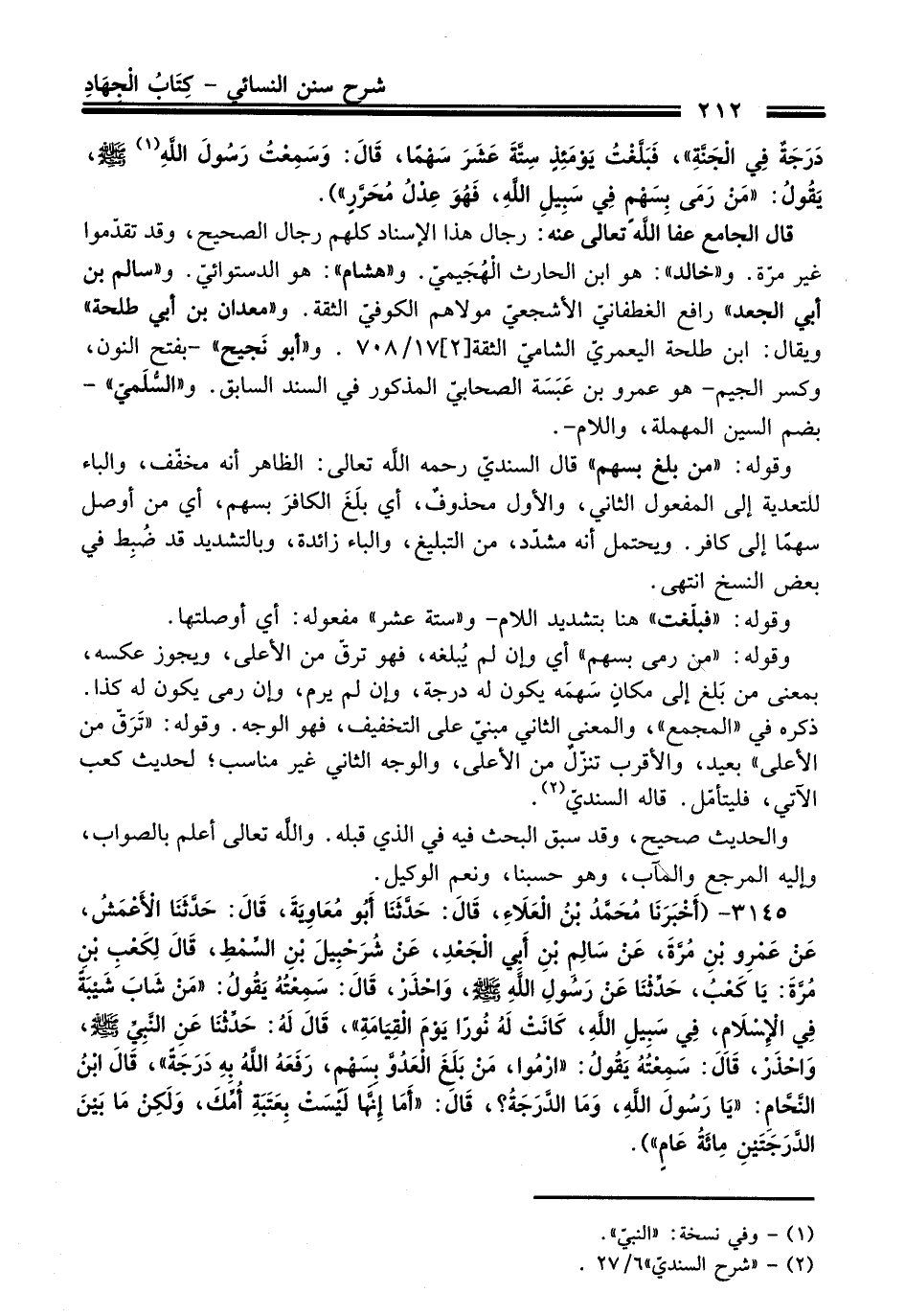 3145 - (أَخْبَرَنَا مُحَمَّدُ بْنُ الْعَلاَءِ, قَالَ: حَدَّثَنَا أَبُو مُعَاوِيَةَ, قَالَ: حَدَّثَنَا الأَعْمَشُ, عَنْ عَمْرِو بْنِ مُرَّةَ, عَنْ سَالِمِ بْنِ أَبِي الْجَعْدِ, عَنْ شُرَحْبِيلَ بْنِ السِّمْطِ, قَالَ لِكَعْبِ بْنِ مُرَّةَ: يَا كَعْبُ حَدِّثْنَا عَنْ رَسُولِ اللَّهِ - صلى اللَّه عليه وسلم -, وَاحْذَرْ, قَالَ: سَمِعْتُهُ يَقُولُ: «مَنْ شَابَ شَيْبَةً فِي الإِسْلاَمِ, فِي سَبِيلِ اللهِ, كَانَتْ لَهُ نُورًا يَوْمَ الْقِيَامَةِ» , قَالَ لَهُ: حَدِّثْنَا عَنِ النَّبِيِّ - صلى اللَّه عليه وسلم -, وَاحْذَرْ, قَالَ: سَمِعْتُهُ يَقُولُ: «ارْمُوا مَنْ بَلَغَ الْعَدُوَّ بِسَهْمٍ, رَفَعَهُ اللَّهُ بِهِ دَرَجَةً» , قَالَ ابْنُ النَّحَّامِ: "يَا رَسُولَ اللهِ, وَمَا الدَّرَجَةُ؟ , قَالَ: «أَمَا إِنَّهَا لَيْسَتْ بِعَتَبَةِ أُمِّكَ, وَلَكِنْ مَا بَيْنَ الدَّرَجَتَيْنِ مِائَةُ عَامٍ»).
