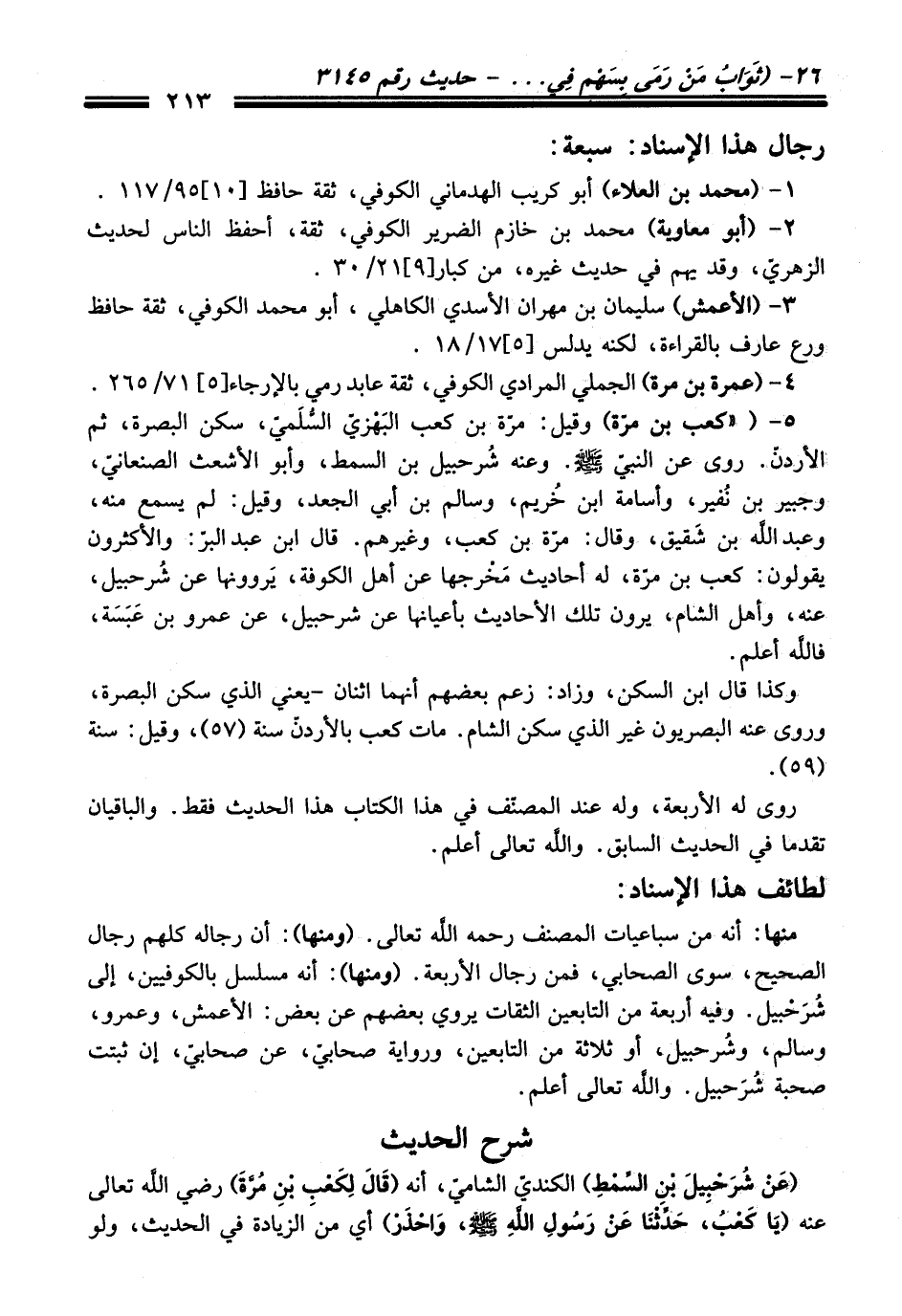 منها: أنه من سباعيات المصنف -رحمه اللَّه تعالى-. (ومنها): أن رجاله كلهم رجال الصحيح، سوى الصحابي، فمن رجال الأربعة. (ومنها): أنه مسلسل بالكوفيين، إلى شُرَحْبيل. وفيه أربعة من التابعين الثقات يروي بعضهم عن بعض: الأعمش، وعمرو، وسالم، وشُرحبيل، أو ثلائة من التابعين، ورواية صحابيّ، عن صحابيّ، إن ثبتت صحبة شُرَحبيل. واللَّه تعالى أعلم.
