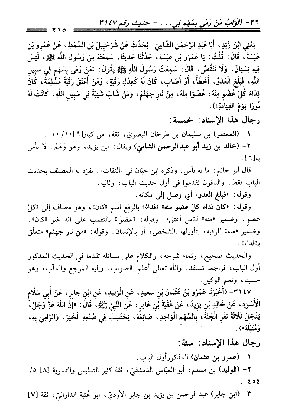 -يَعْنِي ابْنَ زَيْدٍ, أَبَا عَبْدِ الرَّحْمَنِ الشَّامِيَّ- يُحَدِّثُ عَنْ شُرَحْبِيلَ بْنِ السِّمْطِ, عَنْ عَمْرِو بْنِ عَبَسَةَ, قَالَ: قُلْتُ: يَا عَمْرُو بْنَ عَبَسَةَ, حَدِّثْنَا حَدِيثًا, سَمِعْتَهُ مِنْ رَسُولِ اللَّهِ - صلى اللَّه عليه وسلم -, لَيْسَ فِيهِ نِسْيَانٌ, وَلاَ تَنَقُّصٌ, قَالَ: سَمِعْتُ رَسُولَ اللهِ - صلى اللَّه عليه وسلم - يَقُولُ: «مَنْ رَمَى بِسَهْمٍ فِي سَبِيلِ اللهِ, فَبَلَغَ الْعَدُوَّ, أَخْطَأَ, أَوْ أَصَابَ, كَانَ لَهُ كَعِدْلِ رَقَبَةٍ, وَمَنْ أَعْتَقَ رَقَبَةً مُسْلِمَةً, كَانَ فِدَاءُ كُلِّ عُضْوٍ مِنْهُ عُضْوًا مِنْهُ, مِنْ نَارِ جَهَنَّمَ, وَمَنْ شَابَ شَيْبَةً فِي سَبِيلِ اللهِ, كَانَتْ لَهُ نُورًا يَوْمَ الْقِيَامَةِ»).